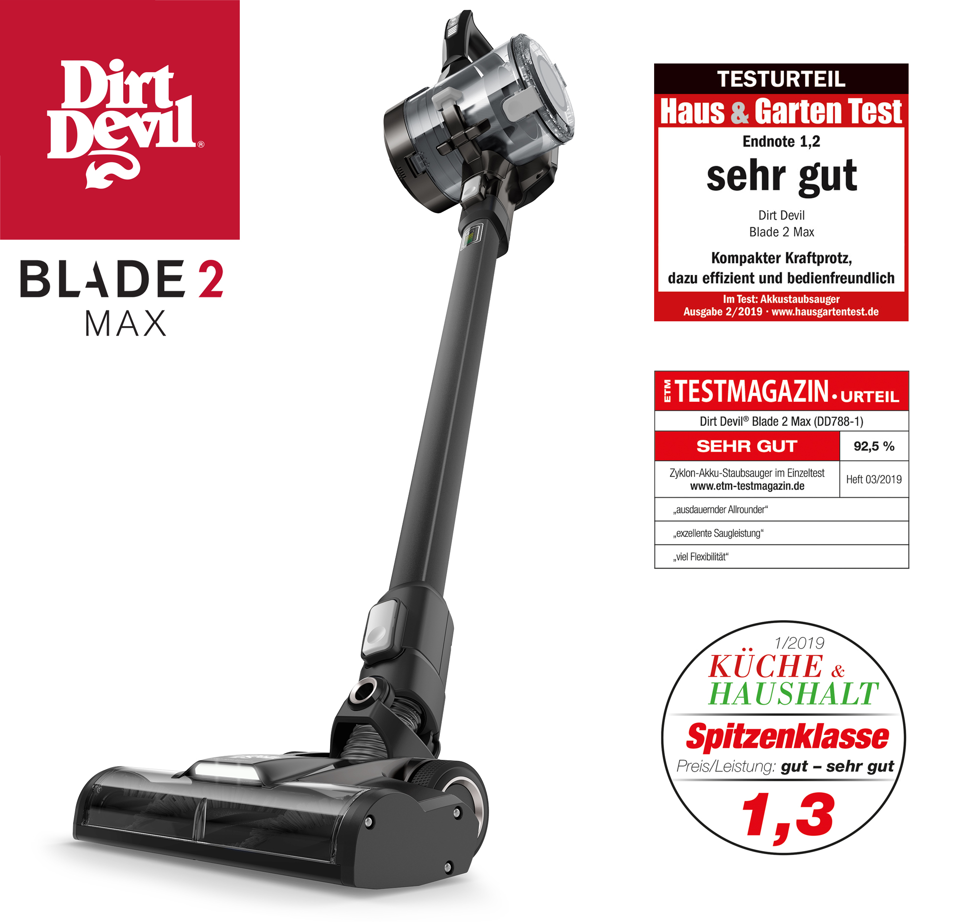Kaum im Handel, stellten gleich drei Testmagazine den Dirt Devil „Blade 2 Max“ auf den Prüfstand. Einhelliges Urteil: Der neue 40V Akku-Handstaubsauger trumpft mit exzellenter Ausdauer, hoher Flexibilität in der Handhabung und herausragender Saugleistung auf.