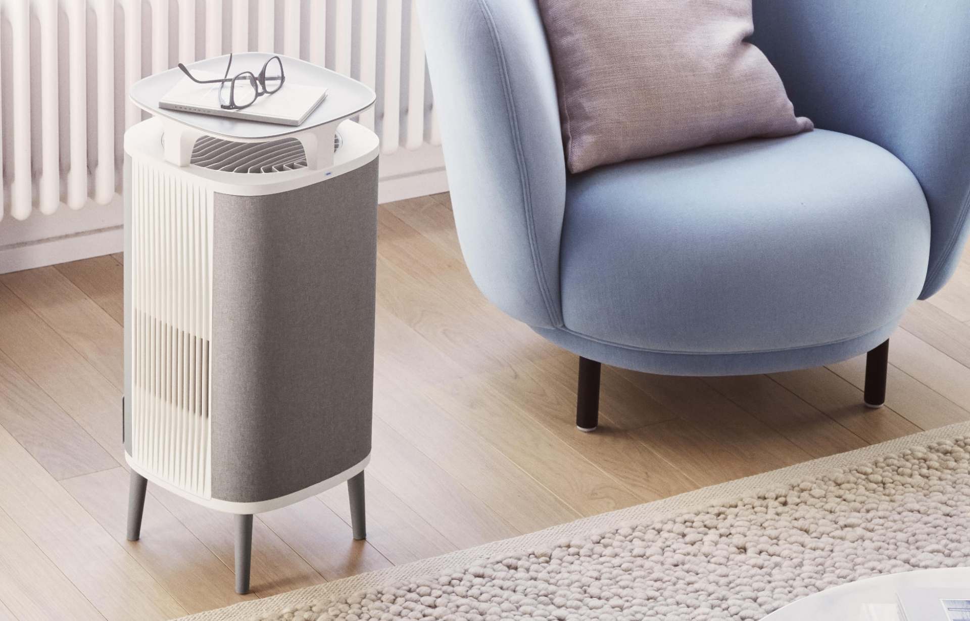 Der Luftreiniger ist wie ein Möbelstücke in skandinavischer Ästhetik gestaltet. Die Oberfläche ist in Form einer Tischplatte geformt.