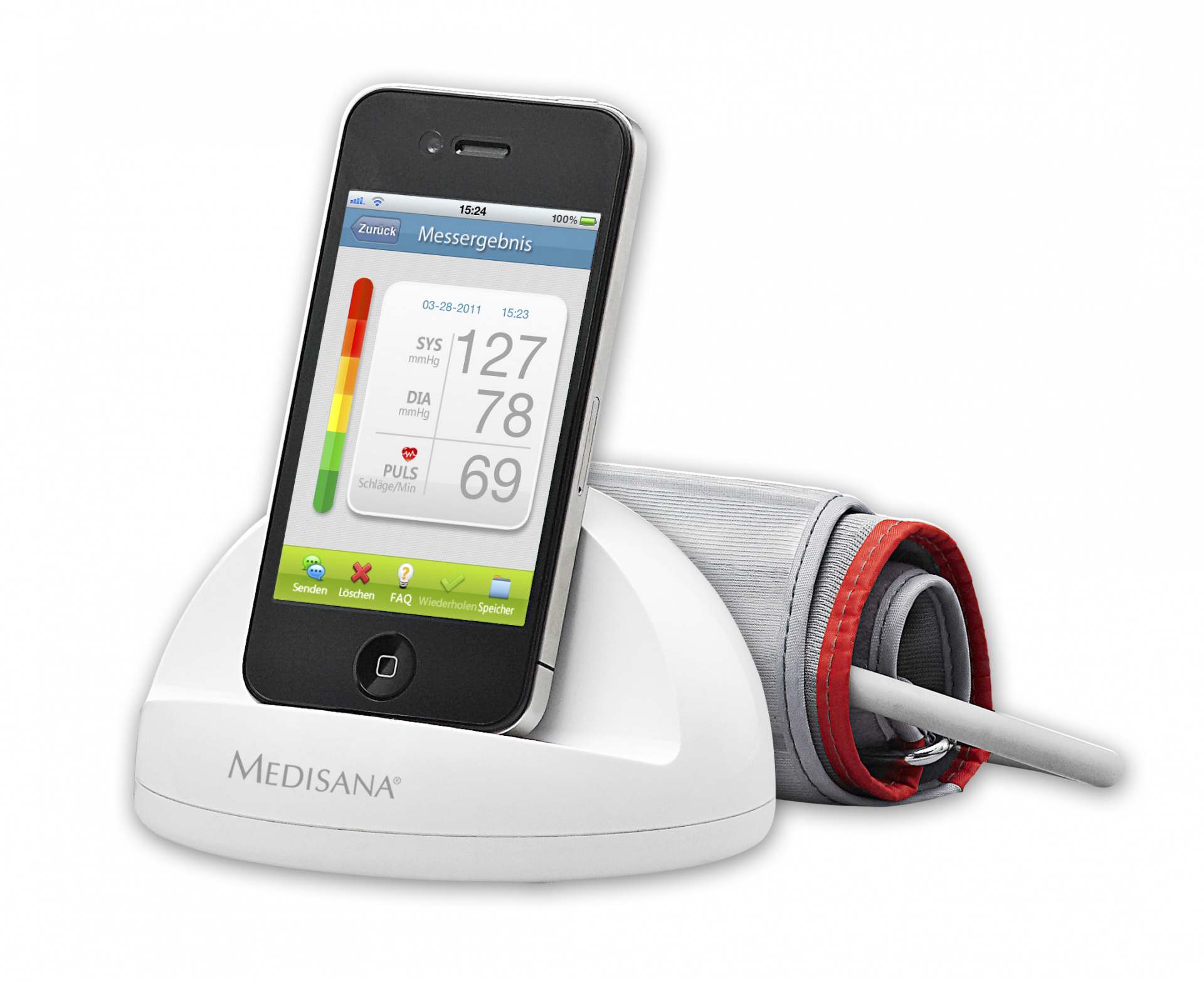 Das Blutdruckmessgerät Medisana iHealth verwandelt die Apple-Modelle iPod touch, iPhone oder iPad im Handumdrehen in ein leistungsstarkes und hochmodernes Blutdruckmesssystem. Mit dem Medisana iHealth Blutdruckmesssystem lassen sich alle Messwerte direkt auf dem iOS-Gerät speichern, auswerten, beobachten und sogar per Mail, zum Beispiel an den Arzt versenden. Das ist ein Novum auf dem deutschen Markt.