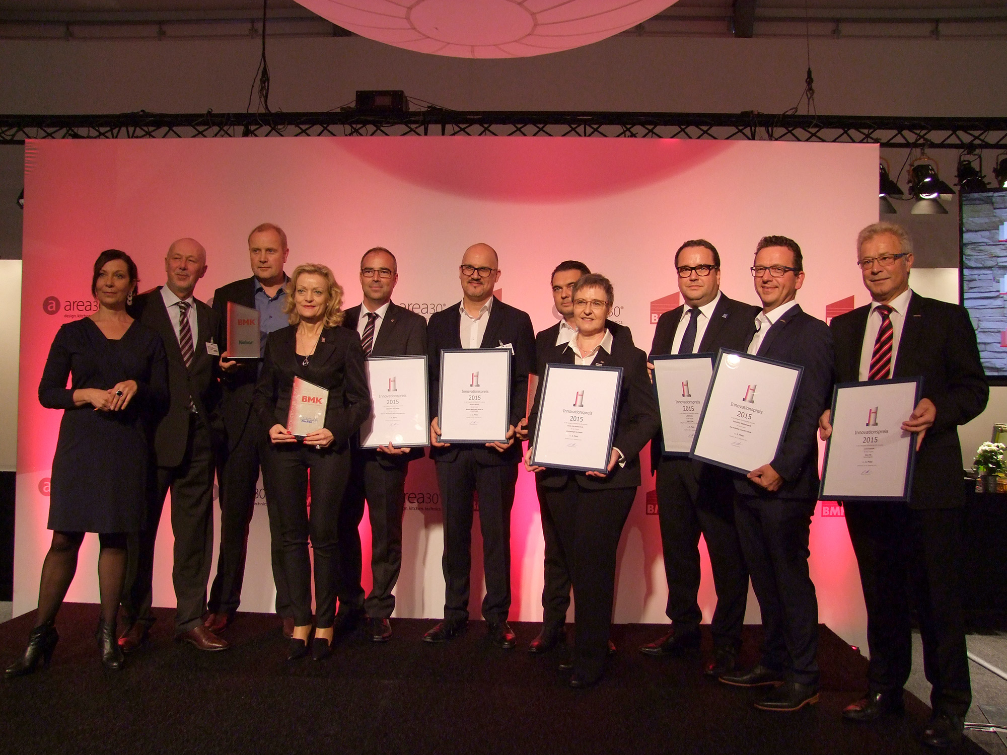Die Gewinner des BMK Innovationspreises 2015 (v.l.) mit Moderatorin Stefanie Martin und BMK Vorsitzenden Hans Hermann Hagelmann: Thomas Voss (Naber), Heidrun Brinkmeyer, (Ballerina), Ulrich Barth, (Leicht), Antonio Terrada (Bosch), Christian Farago (Berbel), Dr. Brigitte Kornmüller (Sedia), Jochen Roth (Liebherr), Markus Schüller (Schüller) und Gerhard Göbel (Systemceram). Foto: BMK