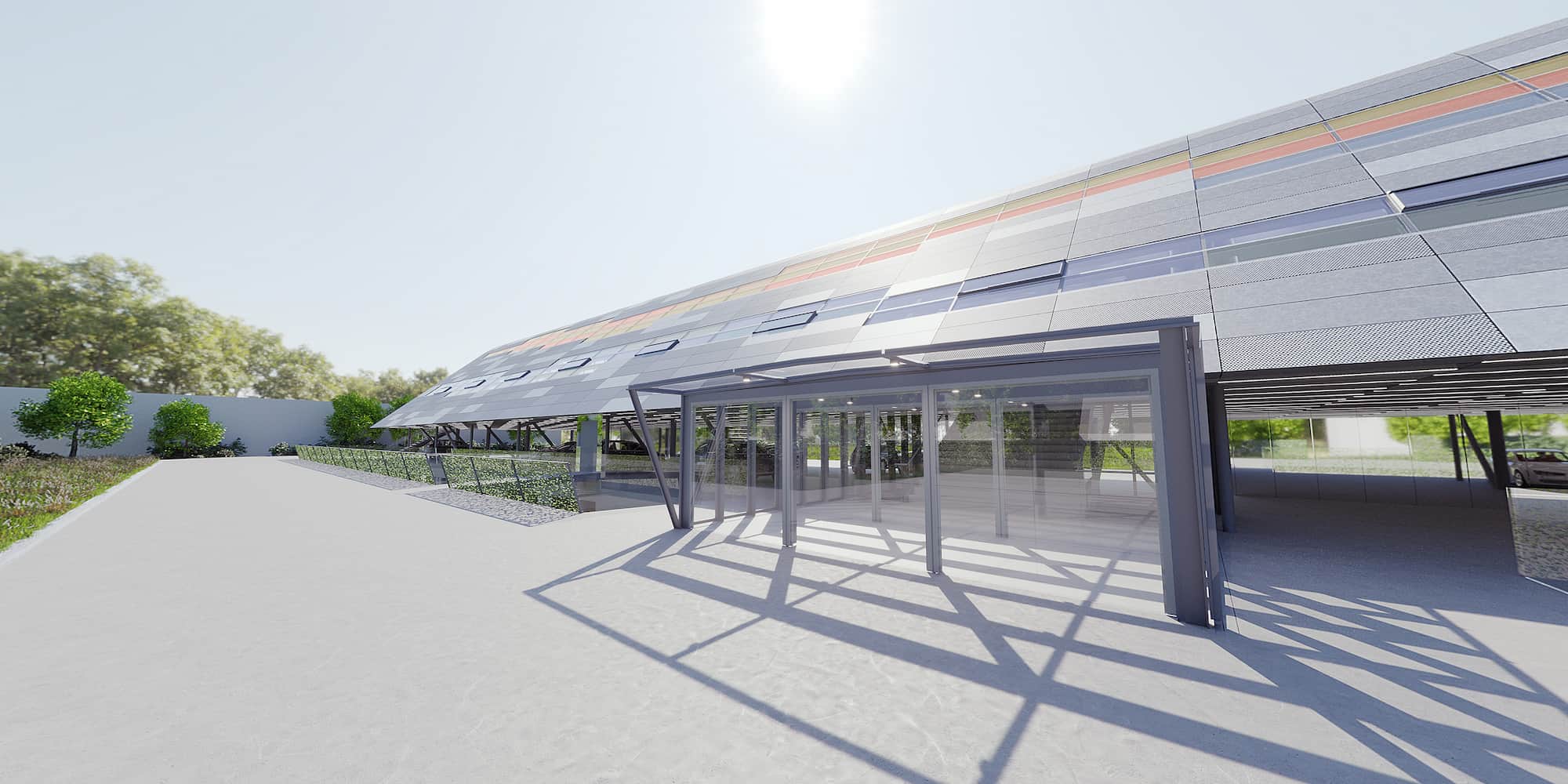 Fast hundert Meter lang birgt das futuristische Gebäude von Bora in Herford nicht nur den eigenen Flagship Store, sondern auch Ausstellungsflächen für Partner aus dem Bereich Bauen, Wohnen und Einrichten. Renderings: Bora