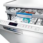 Dass bis zu neun Maßgedecke mit nur sechs Litern Wasser tadellos sauber werden, verdankt der Bosch ActiveWater45 Geschirrspüler ausgefeilten technischen Merkmalen wie dem intelligenten Hydraulik-Pumpensystem, dem bürstenlosen EcoSilenceDrive, der cleveren Raumeinteilung und dem doppelten Sprüharm im Oberkorb. Beim Bosch ActiveWater45 Geschirrspüler greift aber noch eine besondere Effizienztechnologie: So wird das saubere Wasser des letzten Klarspülgangs in einem integrierten Wasserspeicher zwischengelagert – dieser Vorrat dient beim nächsten Programmstart höchst ökonomisch zum Vorspülen. Und wo weniger Wasser im Spiel ist, bleiben auch die Stromverbrauchswerte auf konstant niedrigem Niveau: Energie-Effizienz-Klasse A+ ist hierfür der beste Beweis. Im Bosch ActiveWater45 Geschirrspüler wurden die Programmoptionen erweitert und optimiert. Mit der neuen VarioSpeedPlus-Funktion etwa lässt sich bei Bedarf bis zu 66 Prozent schneller spülen. Das ist ein Spitzenwert und ideal, wenn viele Gäste da sind, eine Party steigt oder größere Koch- oder Backaktivitäten ins Haus stehen. Ebenfalls neu ist die Option HygienePlus: Dank einer exakten Steuerung wird ein hohes Temperaturniveau von etwa 70 Grad Celsius über einen definierten Zeitraum von rund zehn Minuten für eine antibakterielle Wirkung beim letzten Spülgang aufrechterhalten. Der Bosch ActiveWater45 Geschirrspüler kommt auch in Sachen Komfort groß heraus. Zum Beispiel besitzt er die neue Funktion TimeLight, bei der die verbleibende Programmlaufzeit mittels LED auf den Küchenfußboden projiziert wird. Weiß man, wann das Geschirr fertig gespült und getrocknet sein wird, lassen sich viele Abläufe im Haushalt besser planen, vom Aus- und Einräumen bis hin zur nächsten Mahlzeit. „Es werde Licht“ – das gilt genauso für den Innenraum des Bosch ActiveWater45 Geschirrspülers: Beim Öffnen der Türe erstrahlt jetzt auch in seinem Inneren das blaue EmotionLight von Bosch. Auf den Innenbehälter des Bosch ActiveWater45 Geschirrspülers gewährt Bosch eine 10-jährige Garantie gegen Durchrostung. Im Inneren des Bosch ActiveWater45 Geschirrspülers kommen ausschließlich hochwertige Edelstahlfeinbleche zum Einsatz, die mit modernen Fertigungs- und Verbindungstechnologien bearbeitet wurden und mit einer speziellen Oberflächenbehandlung den letzten Schliff erhalten. So erfüllt der Bosch ActiveWater45 Geschirrspüler spielend zwei der in Umfragen am häufigsten genannten Kundenwünsche: Qualität und Langlebigkeit.