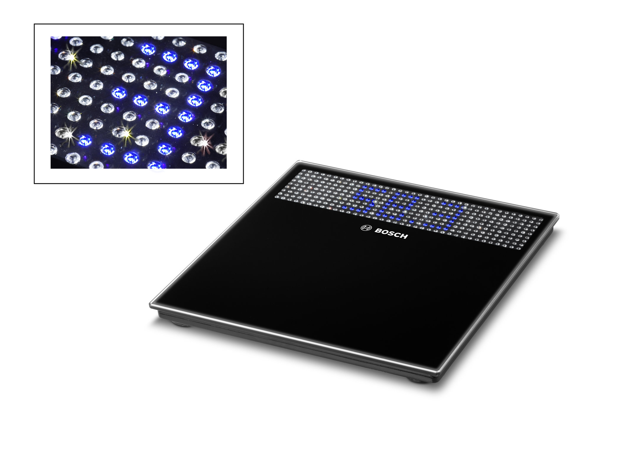 Mit der Bosch AxxenceCrystal Personenwaage wird der regelmäßigen Gang zur Waage jetzt 333-mal schöner. Denn in die schwarzglänzende Trittfläche der neuen Bosch