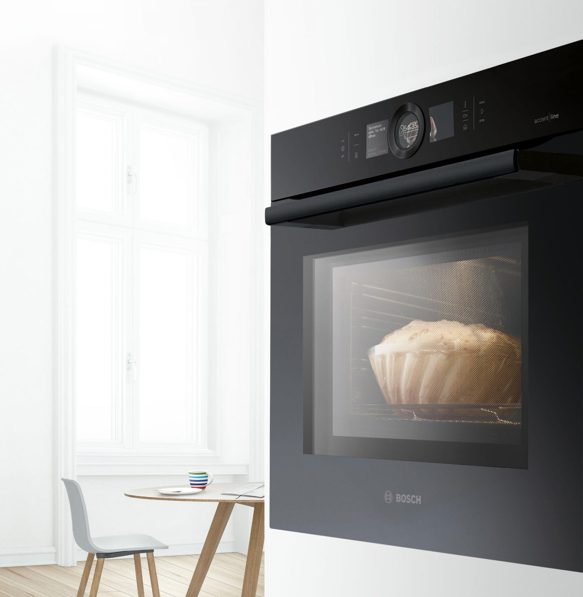 Der Bosch Backofen Serie 8 Carbon Black ist ein Einbaubackofen in einer reduzierten Ästhetik aus gebürstetem schwezem Edelstahl und glatt glänzendem schwarzem Glas.