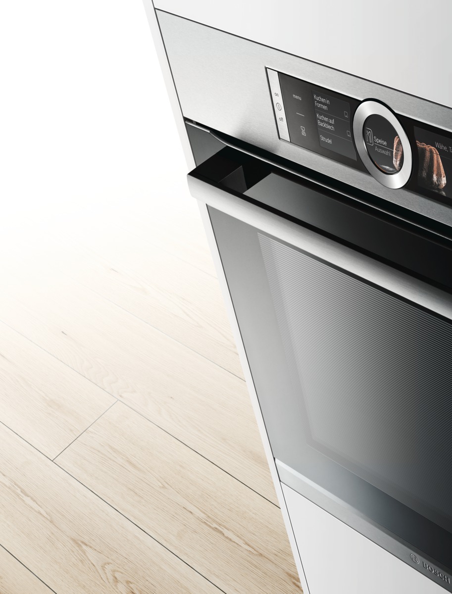 Der Bedienring hat ein präzises haptisches Raster. Dadurch lässt er sich mit nur minimalem Druck genau steuern. Das Drehrad navigiert einfach und sicher durch die intuitive Menüführung und – wenn gewünscht – durch den Bosch Assist. Dabei sind nur noch minimale Angaben zur Art des Gerichts – z. B. Braten oder Kuchen – erforderlich: Das Gerät wählt dann selbstständig die Zubereitungsart aus, die das jeweils beste Back- und Bratergebnis erzielt. Der Bosch Assist schaltet automatisch, wo immer sinnvoll, den PerfectBake Backsensor, das PerfectRoast Bratenthermometer oder die 4D Heißluft zu.