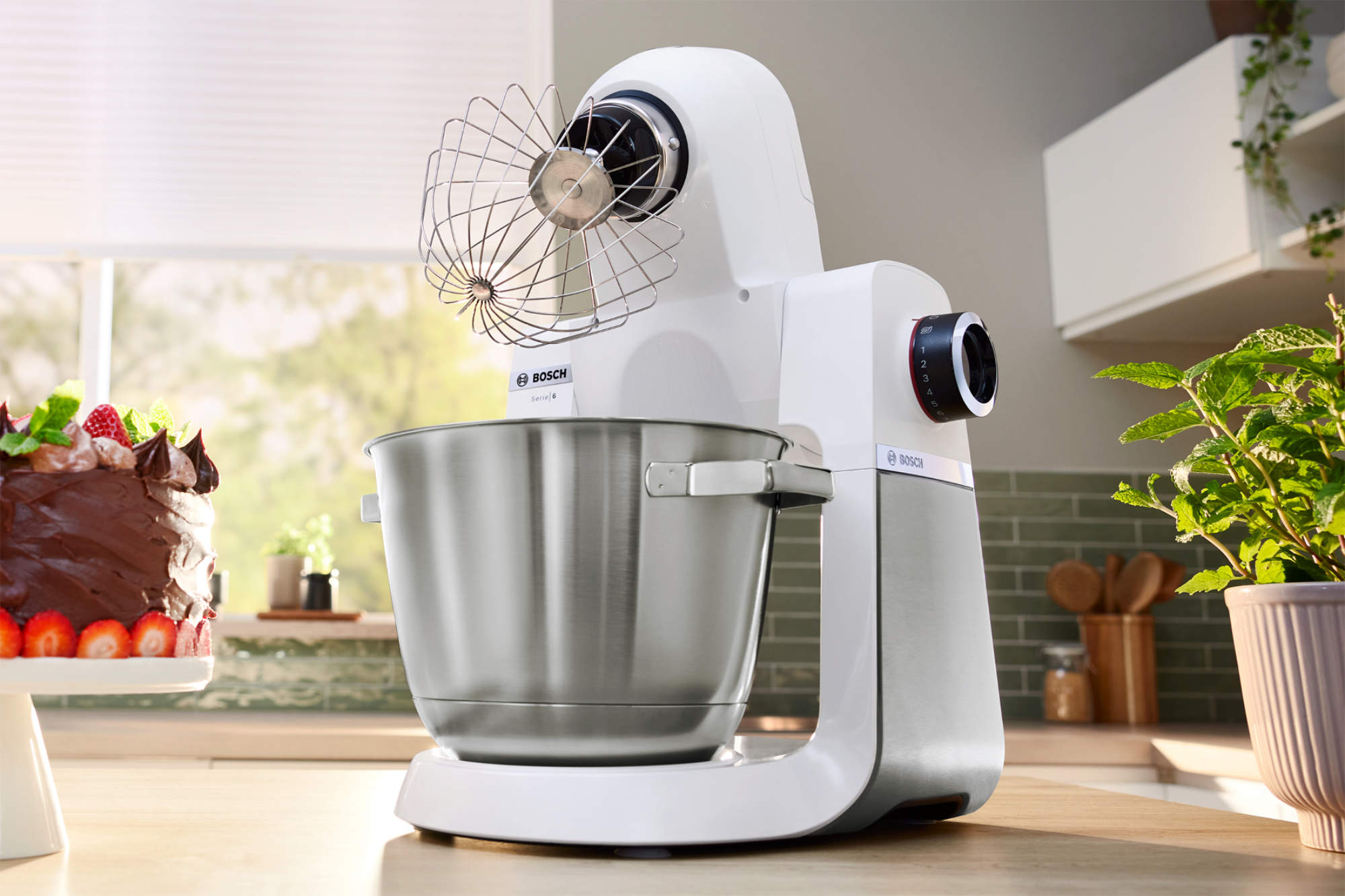 Die Farbe Weiß in Verbindung mit einem einzigartigen Design macht die „Küchenmaschine Serie 6“ zu einem Eyecatcher in jeder Küche. Schönheit trifft auf Leistung, denn der kraftvolle Helfer sorgt mit einem 1.600 Watt starken Motor dafür, dass auch schwerste Teige mühelos verknetet werden