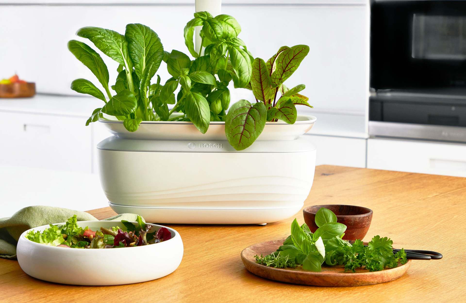 Das Bosch Indoor Gardening System SmartGrow Life verpflanzt den Kräutergarten nach drinnen.