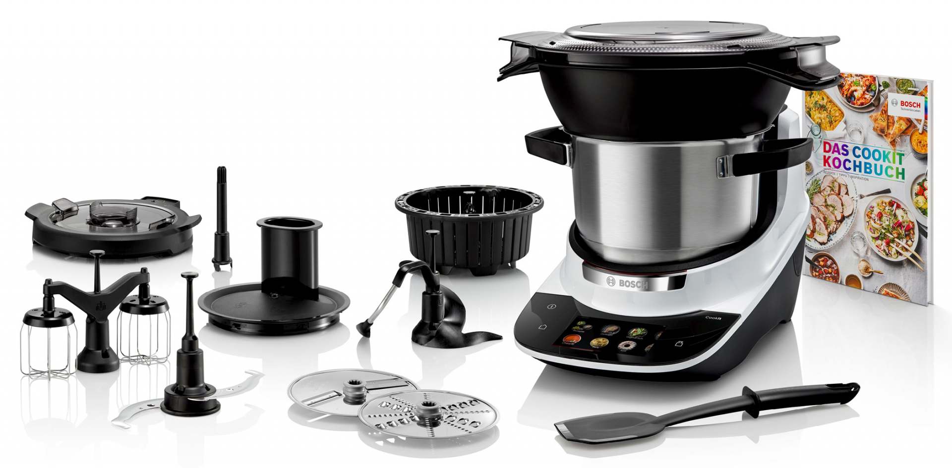 Die Bosch Küchenmaschine Cookit ist eine vernetzte Multifunktions-Küchenmaschine mit Kochfunktion. Drei Kochvarianten stehen zur Verfügung. So kann der Benutzer mit Hilfe von Schritt-für-Schritt-Anleitungen, dem sogenannten Guided Cooking, aus zahlreichen vorinstallierten Rezepten sein Lieblingsgericht wählen und einfach nachkochen. Oder er verlässt sich auf die Unterstützung durch Automatikprogramme. Für die größtmögliche Experimentierfreude wartet die Küchenmaschine mit einem manuellen Kochprogramm auf.