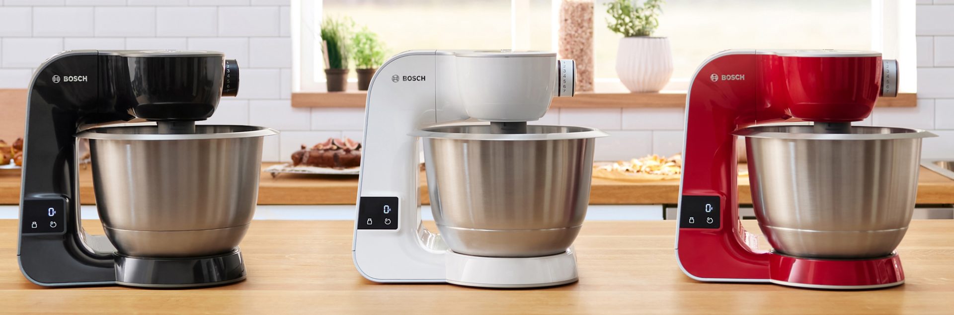Die Bosch Küchenmaschine MUM 5 mit integrierter Waage ist neben klassischem Weiß in den Farben Schwarz, Greige und Rot erhältlich.