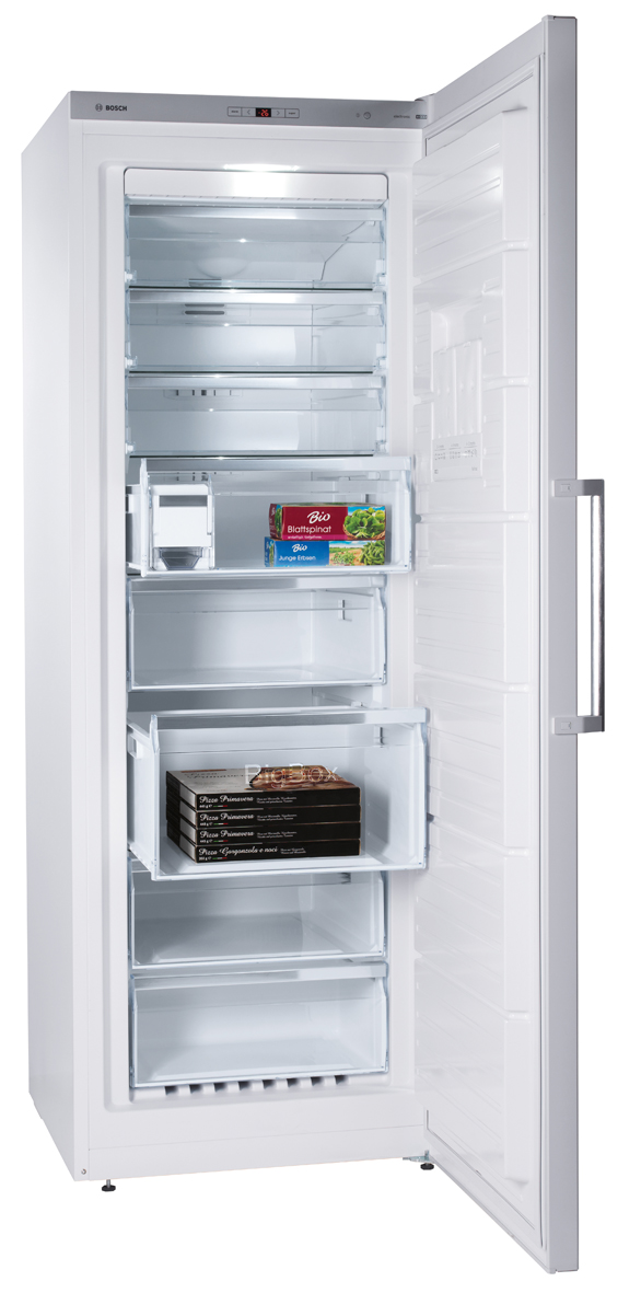 Der Bosch Maxi-Freezer Gefrierschrank ist ab September 2012 im Handel erhältlich: Höhe 161 cm für 1049,00 Euro, Höhe 176 cm für 1099,00 Euro, Höhe 191 cm für 1149,00 Euro (Preise UVP).
