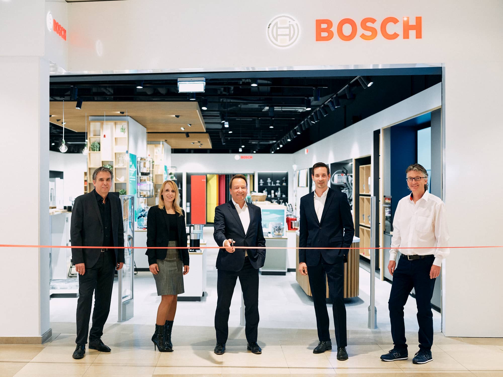 Eröffnung unter erschwerten Bedingungen (v.l.n.r.): Christian Walder (Key Account Manager Umdasch), Heidelinde Zinser (Center Managerin Shoppingcity Seiersberg), Michael Mehnert (CEO BSH Österreich), Stefan Tenor (Vertriebsleiter Bosch Stores Österreich) sowie Frank Fischer (Bosch Store Manager). Fotos: Umdasch/Alexander Krischner