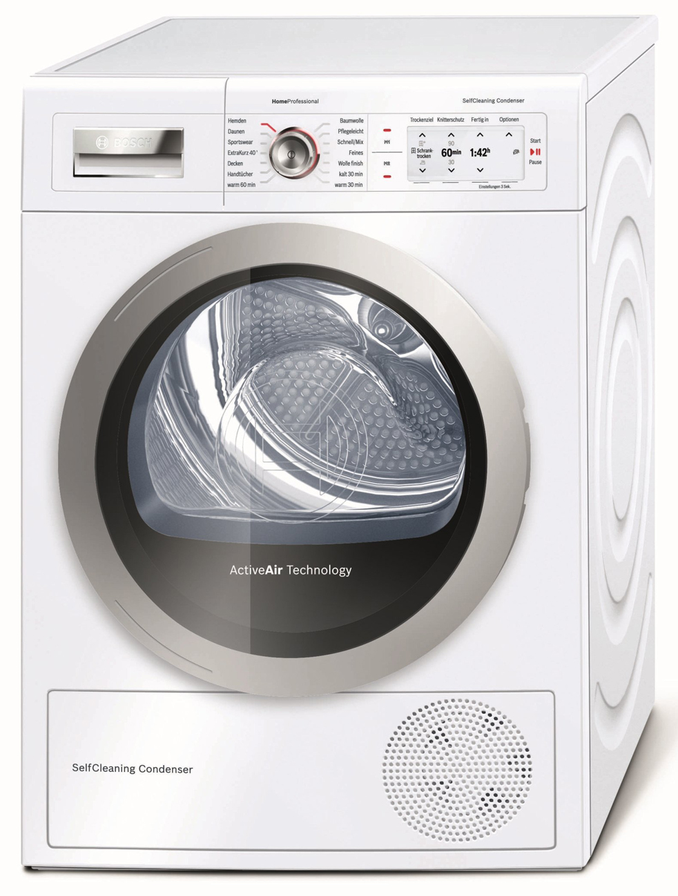 Der Bosch Wärmepumpentrockner EcoLogixx WTW86270 trocknet eine Trommel voll Baumwollwäsche bis zu 35 Minuten schneller als die Wärmepumpentrockner, die der Hersteller bislang angeboten hat.