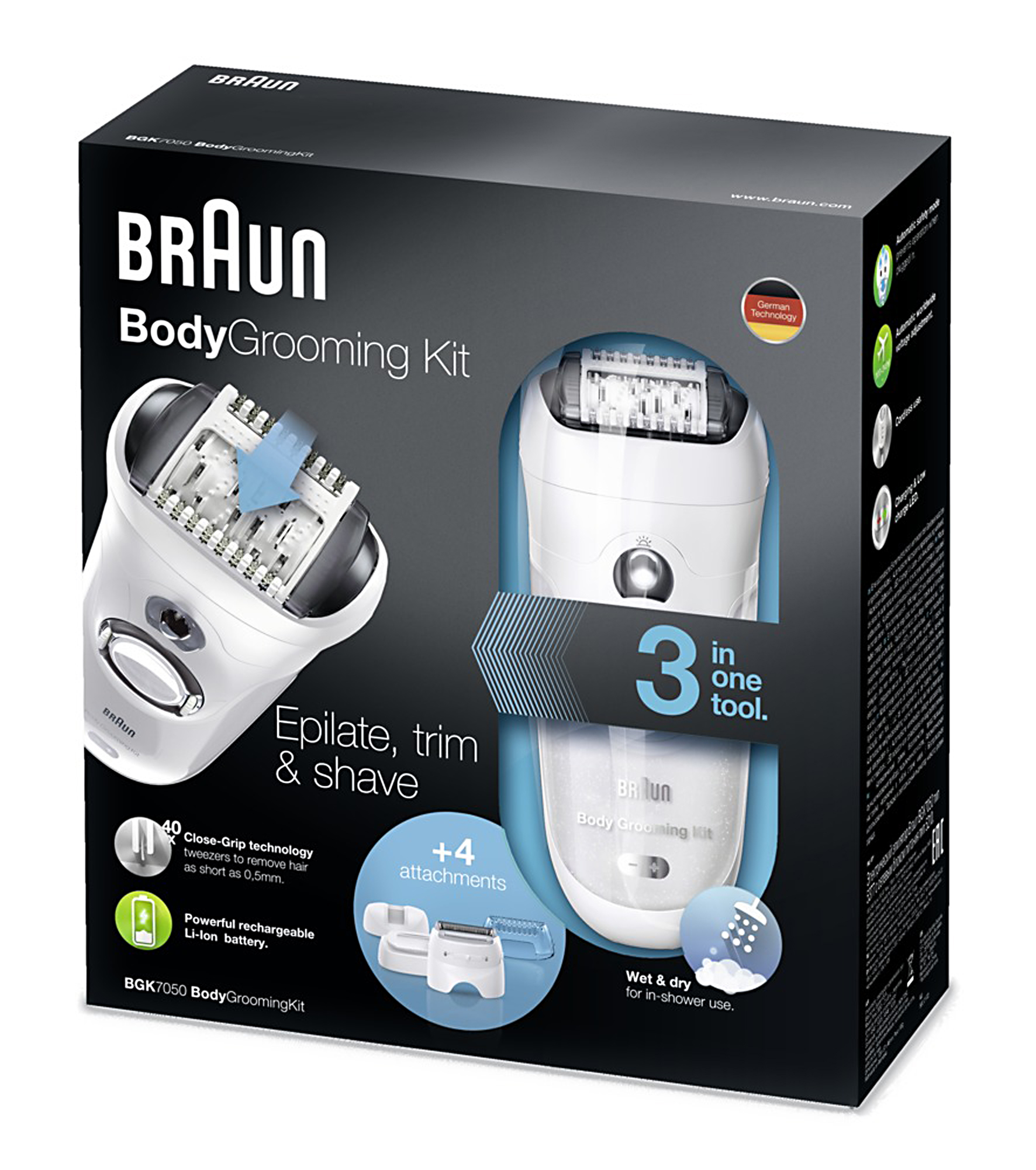 Das Braun Body Grooming Kit Serie BGK ist ein Gerät zum Epilieren, Rasieren und Trimmen. Es entfernt mit Close-Grip Technologie schon Haare so fein wie ein Sandkorn (ab 0,5 mm). Dem Anwender stehen zwei Epilierstufen zur Verfügung: Stufe 1, sanft und Stufe 2 gründlich. Bei der Rasur passt sich der bewegliche Epilierkopf den Körperkonturen an und die Smartlight-Funktion macht selbst feinste Haare sichtbar.