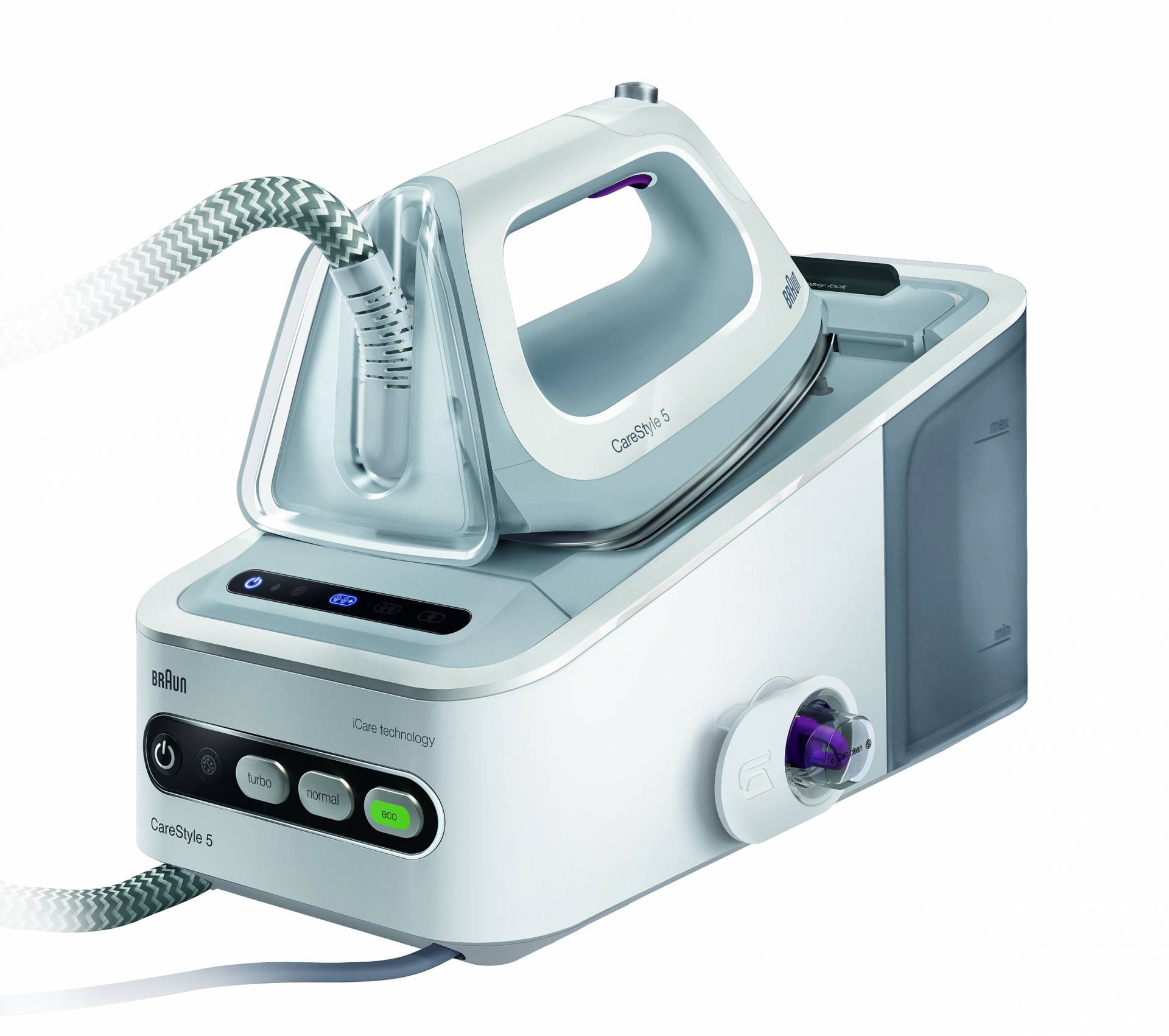 Die Eco-Funktion der Braun Dampfbügelstation CareStyle 5 Pro IS 5055 reduziert, im Vergleich zum Normal-Modus, den Dampfstoß bei gleich bleibender Temperatur. Die automatische Sicherheitsabschaltung des Bügeleisens wird nach 10 Minuten aktiviert. Durch die Transportverriegelung ist das Gerät sicher auf der Station fixiert und kann so kompakt und sicher transportiert und verstaut werden.