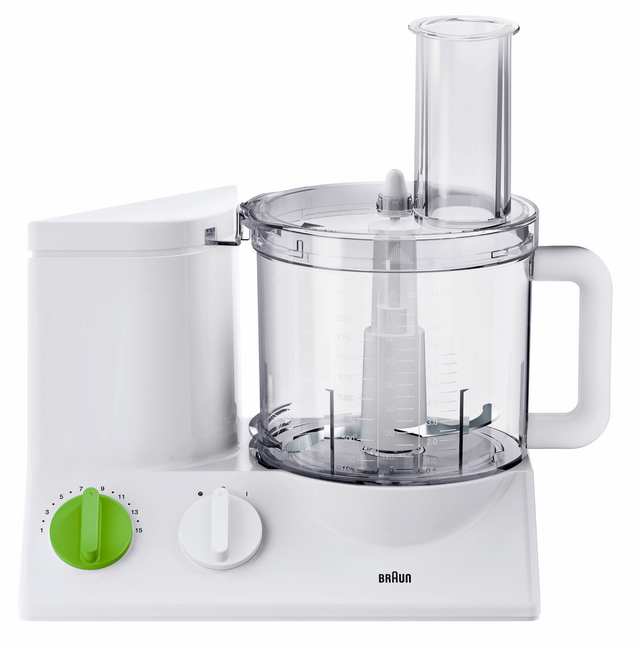 Die Braun Küchenmaschine FP 3010, ein Gerät aus der TributeCollection, ist mit klaren geometrischen Grundformen und sparsamen grünen Farbakzenten gestaltet. Sie erzeugen beim neu aufgelegten Klassiker eine zeitlose Ästhetik. ist ein. Zur Serie gehören unter anderem eine weitere Küchenmaschinen, ein Stand- und einen Stabmixer sowie zwei Zitruspressen.