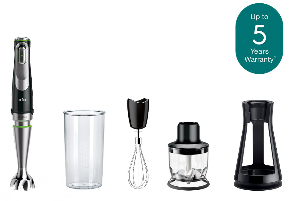 Als Zubehör gehören zu dem limitierten Stabmixer ein Schneebesen aus Edelstahl, ein Zerkleinerer, mit 350 ml Fassungsvermögen, ein Hackmesser sowie ein BPA-freier Mix- und Messbecher mit 600 ml Fassungsvermögen.