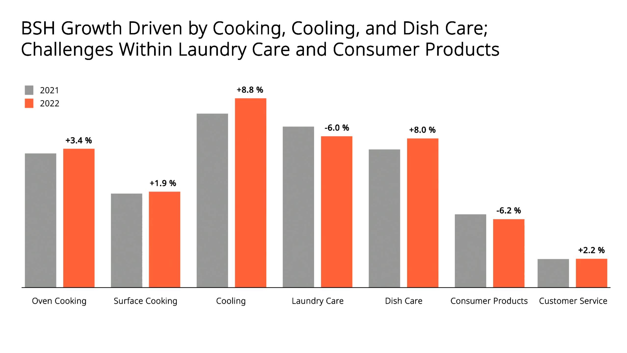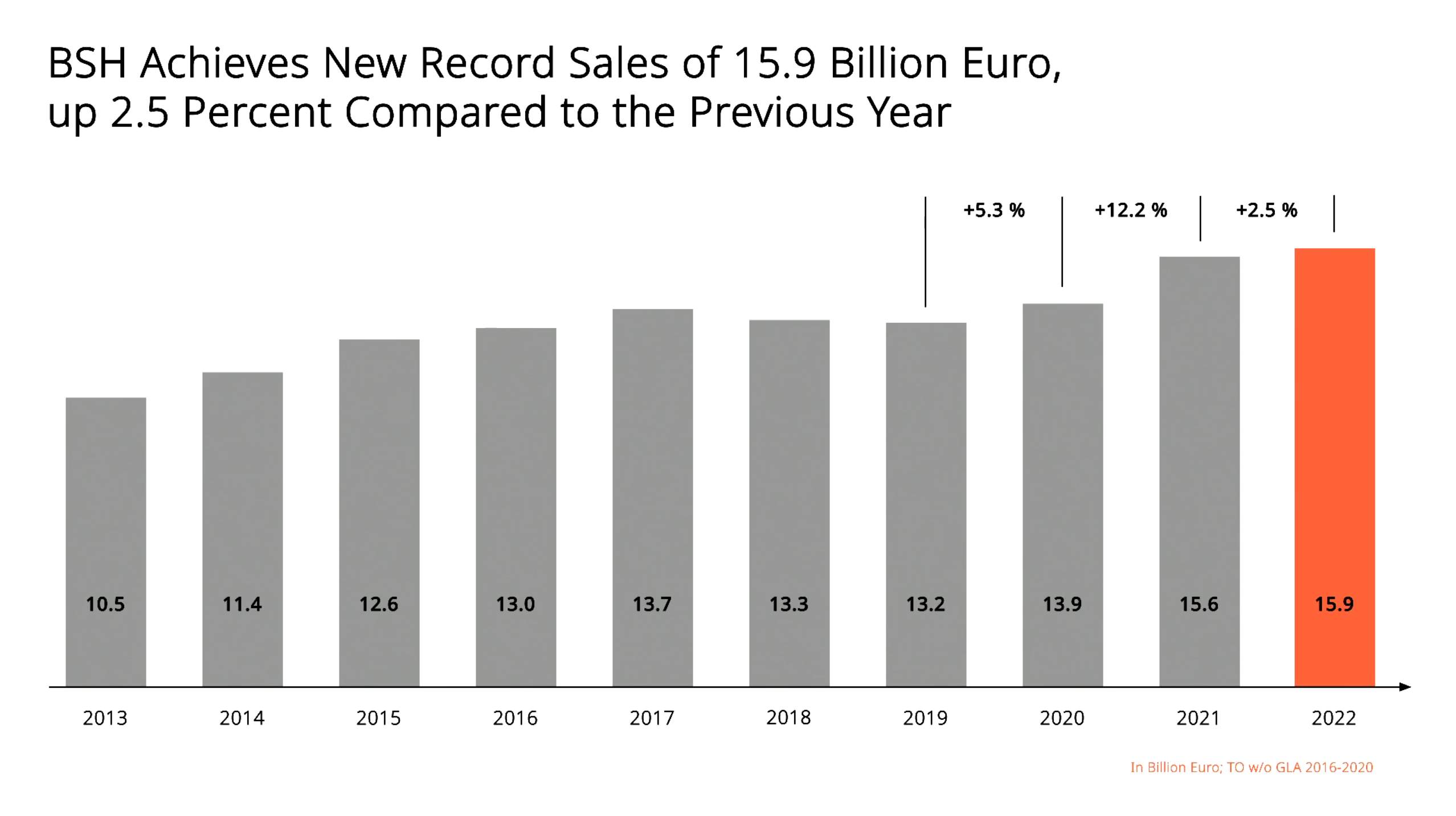 Alles in allem blickt auch Europas führender Hausgerätehersteller auf ein anspruchsvolles Jahr zurück, das von Lieferengpässen, gestiegenen Materialpreisen sowie höheren Logistik- und Energiekosten als Folge des Krieges in der Ukraine und allgemein angespannten Lieferketten geprägt war. In den beiden Vorjahren profitierte die BSH, bedingt durch die Corona-Pandemie, von einer Sonderkonjunktur im Konsumgütergeschäft.