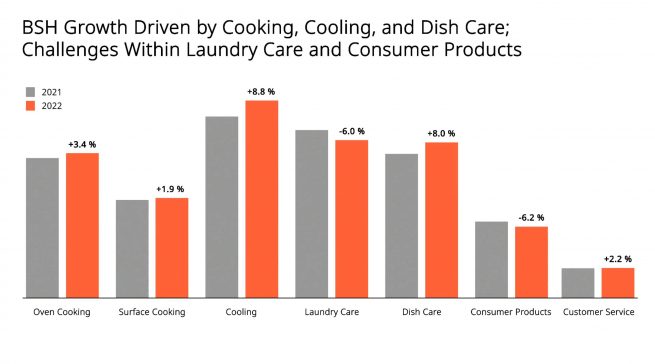 Im dritten Jahr in Folge konnte die BSH Hausgeräte ein Rekordjahr verzeichnen und erzielte im Geschäftsjahr 2022 einen Umsatz von 15,9 Mrd. EUR. Das entspricht einem Wachstum von 2,5% gegenüber dem Vorjahr (wechselkursbereinigt 4,2%), der allerdings den Preiserhöhungen geschuldet ist. Denn beim Absatz konnten die Münchener das Vorjahresergebnis nicht erreichen. Federn lassen musste die BSH sowohl in der Küche (Consumer Products -6,2%) als auch in der Waschküche (Wäschepflege -6%). Mehr Freude machten Kühlen (+8,8%) und Spülen (+8%) sowie der Cookit und das Thema Bodenpflege.