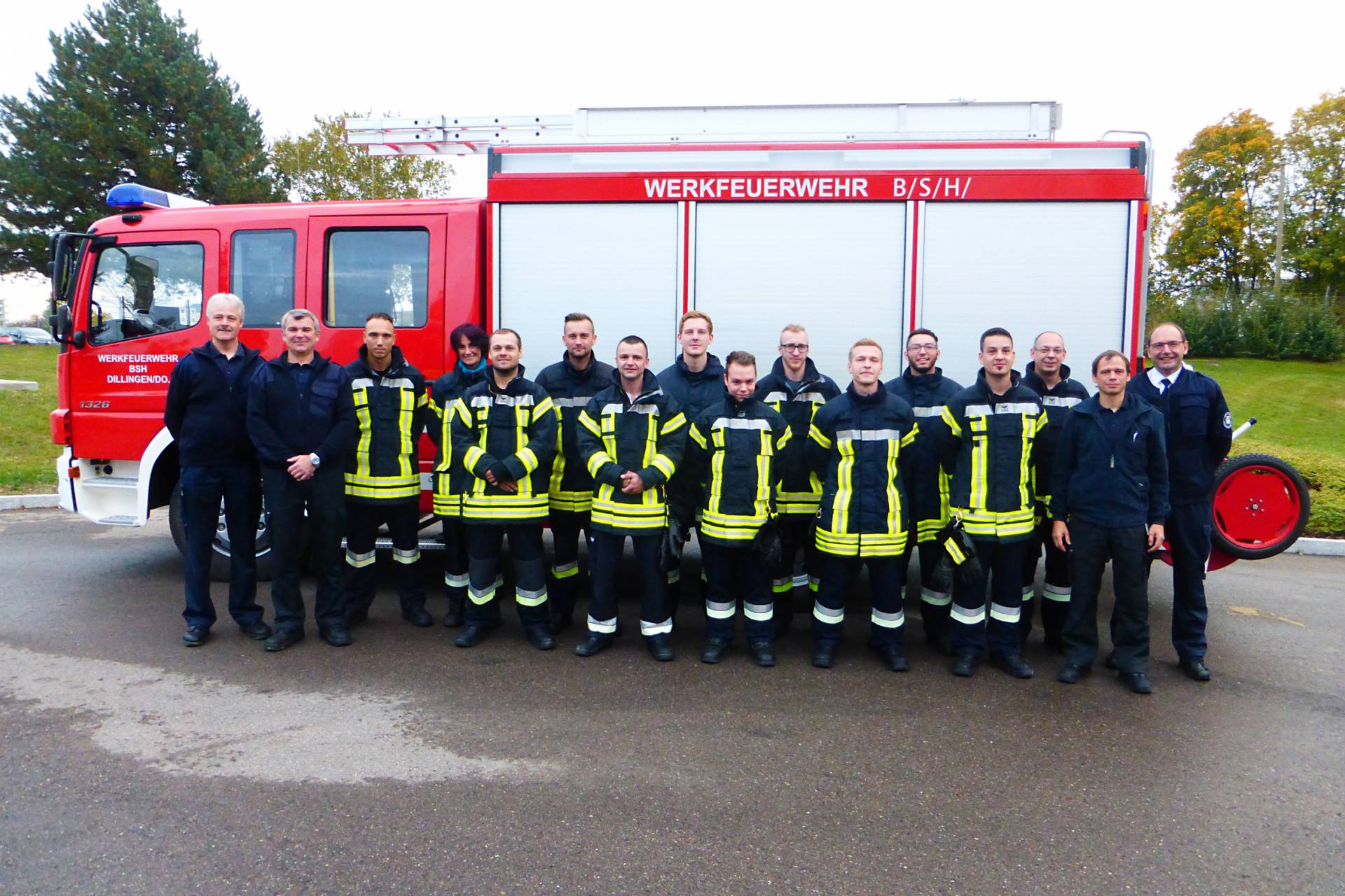 Seit 2015 gilt für die freiwilligen und nebenberuflichen Feuerwehrleute in Bayern die sogenannte „Modulare Truppausbildung“. Diesen Grundlehrgang absolvierten zehn neue Floriansjünger der Werkfeuerwehr der BSH Hausgeräte sowie zwei Kollegen von Securitas am Standort Dillingen. Hinter ihnen liegen 165 intensive Stunden Ausbildung in gerade einmal 18 Tagen. Neben den Grundlagen wurde der Schwerpunkt auf die Gefahrenabwehr im Werk gelegt. „Vor allem die Brandbekämpfung mit Schaum ist für uns ein sehr wichtiges Thema”, sagt Olaf Dehlau, Leiter der BSH-Werkfeuerwehr in Dillingen. Standortleiter Peter Kaltenstadler konnte sich überzeugen, wie die Kollegen durch Kreisbrandrat Frank Schmidt und Kreisbrandmeister Wolfgang Weber praktisch und theoretisch geprüft wurden. Bei der abschließenden Zeugnisübergabe bedankte sich Kaltenstadler bei den Absolventen für ihre Bereitschaft, sich aktiv am Brandschutz zu beteiligen und damit zur Sicherheit der Arbeitsplätze beizutragen.