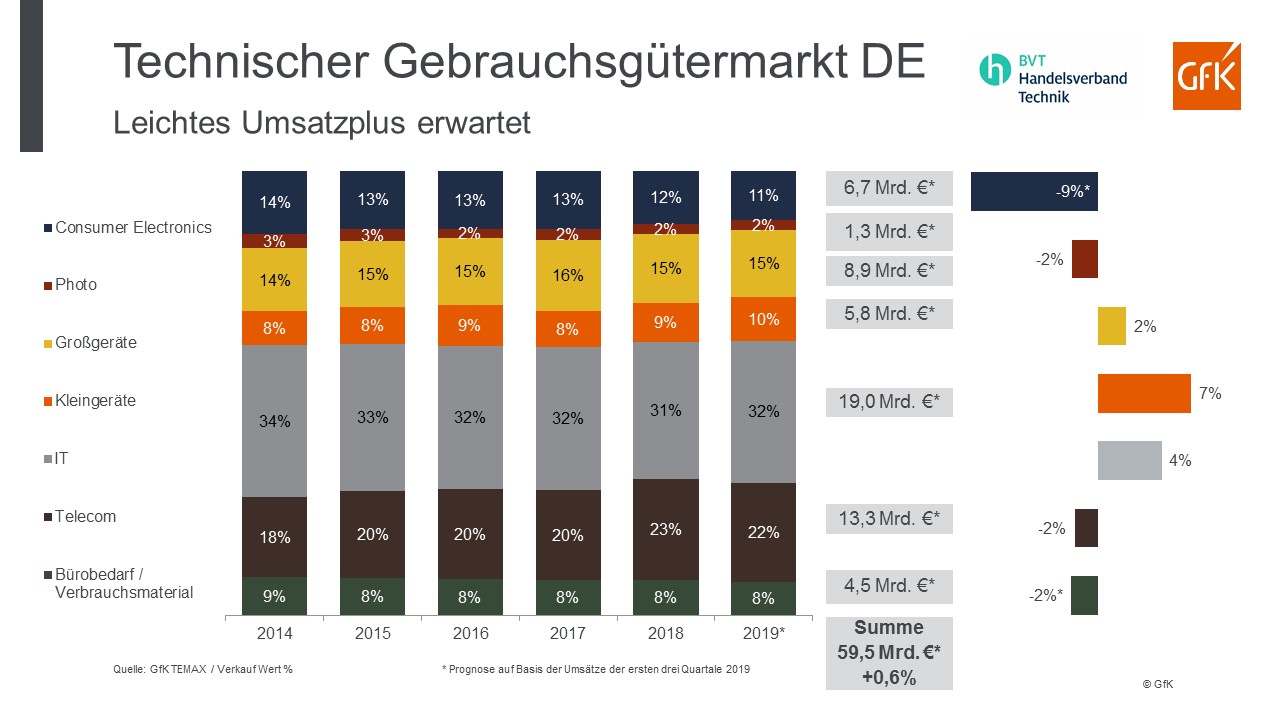 In der Jahresbetrachtung zieht der BVT-Geschäftsführer folgendes Fazit: „Dank Vollbeschäftigung und stabilem Einkommen werden die Deutschen im Jahr 2019 voraussichtlich 59,5 Milliarden Euro für Technische Gebrauchsgüter ausgeben. Dies entspricht einem leichten Plus von 0,6 % im Vergleich zum Vorjahr.
