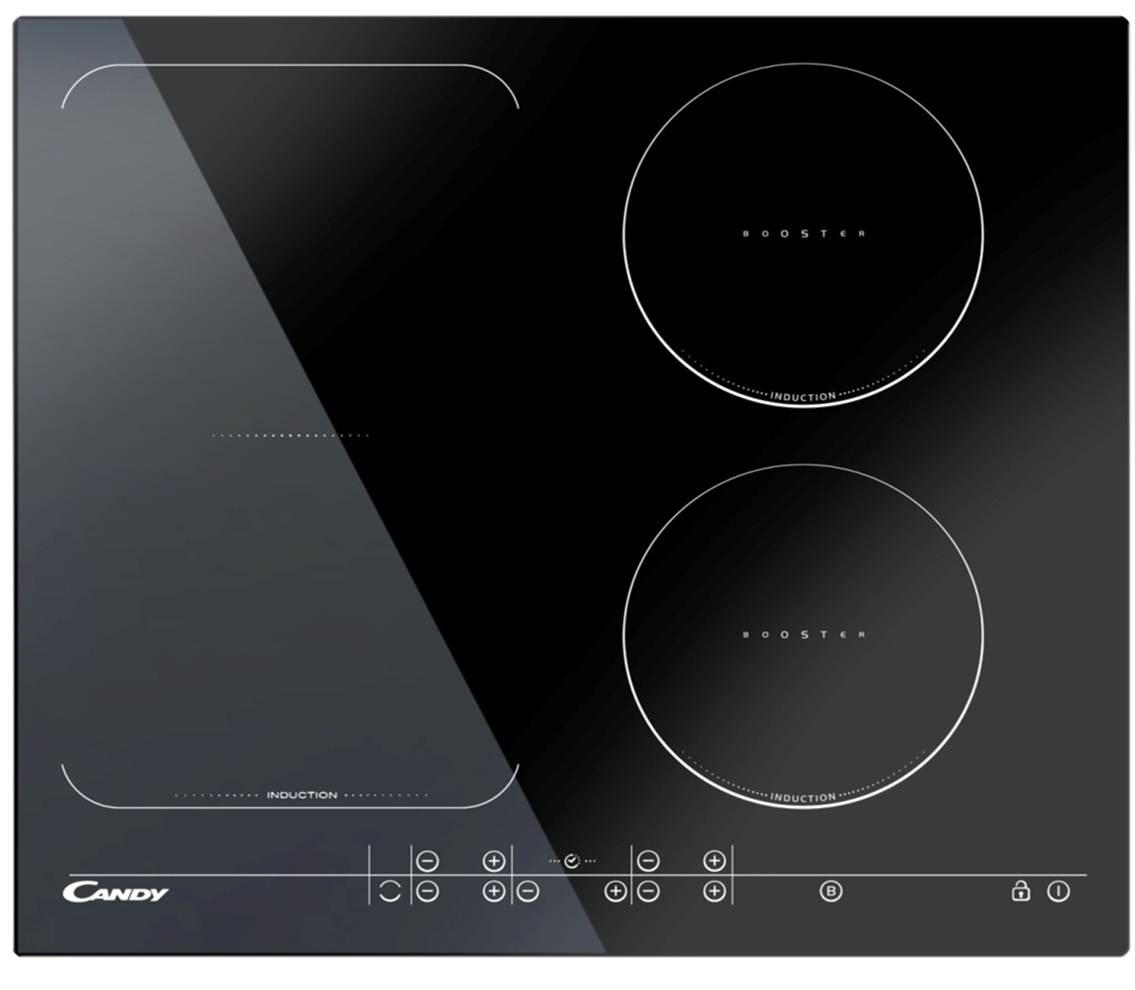 Das Candy CFID 36 Induktionskochfeld ist unterteilt in zwei Kochzonen und eine komplett nutzbare Flächenkochzone, die wiederum in zwei unabhängige Kochzonen unterteilt werden kann. Der Anschlusswert beträgt starke 7.200 Watt, die in 15 Leistungsstufen, unter anderem mit Booster, abgerufen werden können. Jede Kochzone verfügt über einen eigenen Timer sowie über Restwärmeanzeige