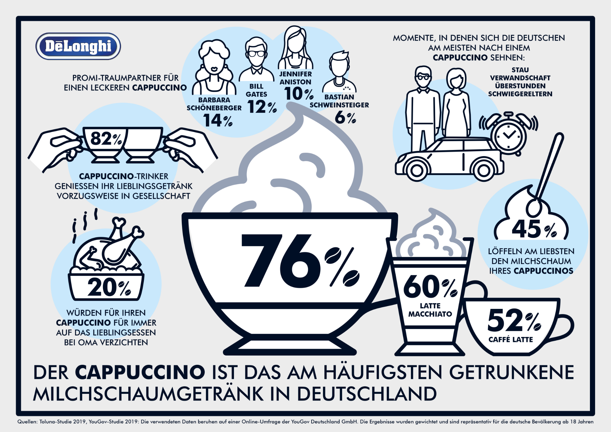 Egal ob Löffler, Schlürfer oder Schaumschläger – die Deutschen trinken ihren Cappuccino von allen Milchschaumgetränken am liebsten. Noch vor dem Latte Macchiato (60%) und dem Caffè Latte (52%) ist der Cappuccino (76%) das am häufigsten getrunkene Milchschaumgetränk in Deutschland. Vor allem sein vollmundiges Aroma (38%), der feinporige Milchschaum (24%) und seine Cremigkeit (18%) machen ihn so unwiderstehlich. Die Liebe der Deutschen zu ihrem Cappuccino geht sogar so weit, dass 20% eher auf das Lieblingsessen bei Oma verzichten würden, als nie wieder einen Cappuccino zu trinken. Weitere 13% würden auf ewig Süßigkeiten und 6% sogar lebenslänglich dem Sex abschwören. Zu diesem Ergebnis kommen zumindest zwei neue Studien, die die beiden Meinungsforschungsinstitute YouGov und Toluna im Auftrag von De’Longhi durchgeführt haben.