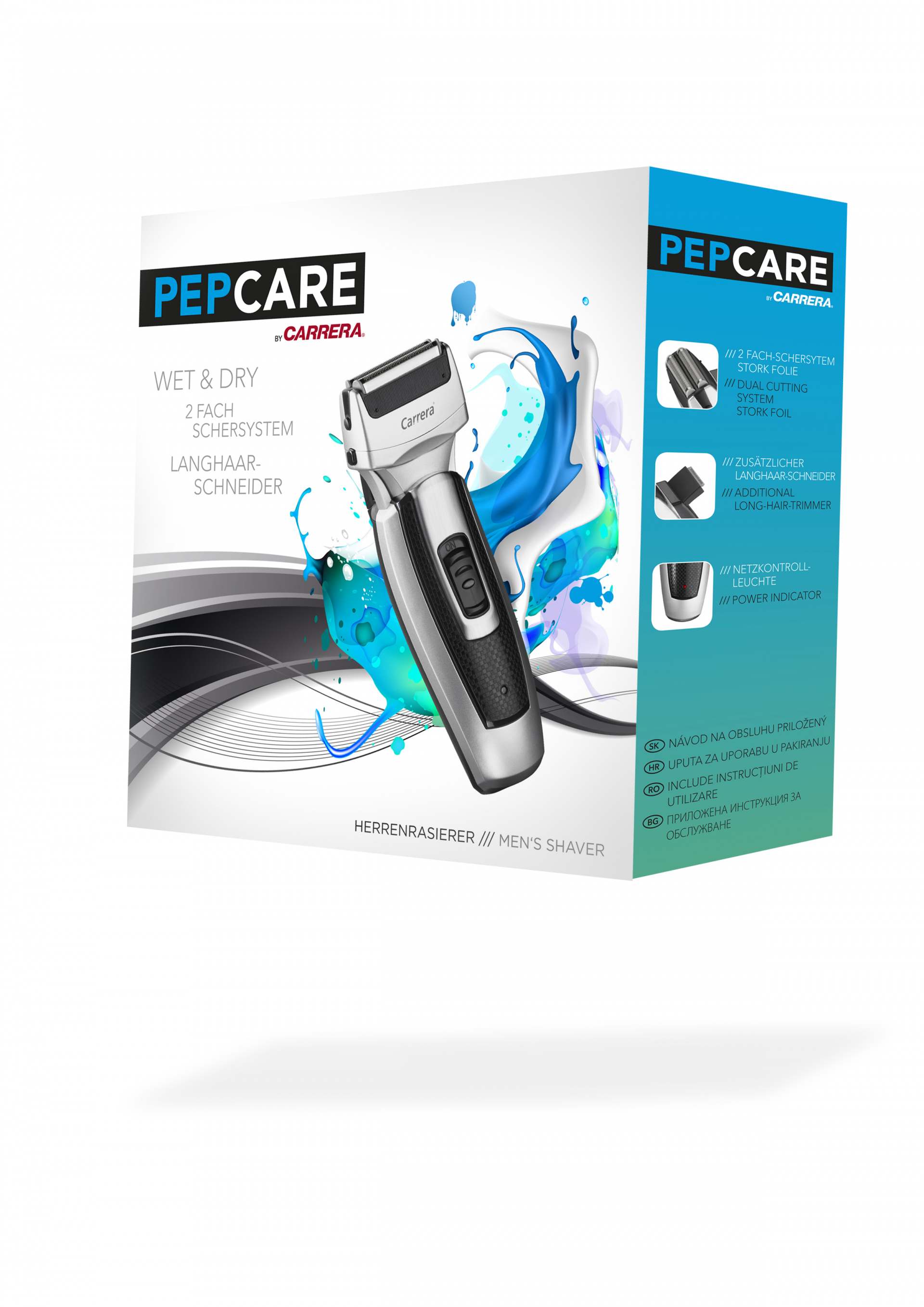 Der Carrera Pepcare Rasierer mit seinem 2fach-Schersystem und der Wet&Dry-Option macht die tägliche Rasur zum Vergnügen. Das 2fach-Schersystem mit Stork Folie ist für das besonders schonende Gleiten über die empfindliche Gesichtshaut zuständig. Ein ausklappbarer Langhaarschneider sorgt für Flexibilität. Dazu ist der Carrera Pepcare Rasierer auch noch sehr leise – damit die Rasur zu zum Genuß wird.