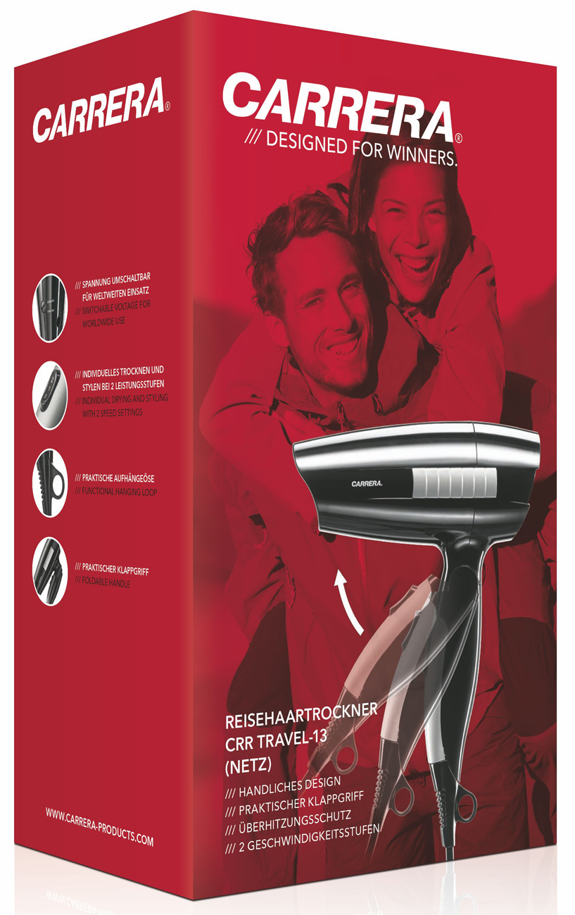 Der Carrera Red Line Haartrockner CRR RHT ist ein Reisehaartrockner mit Netzbetrieb und umschaltbarer Spannung (Dual Voltage: 120/230 V) für den weltweiten Einsatz. Zur Verfügung stehen bei zwei Heiz-/ Geschwindigkeitsstufen zum individuellen Trocknen und Stylen.