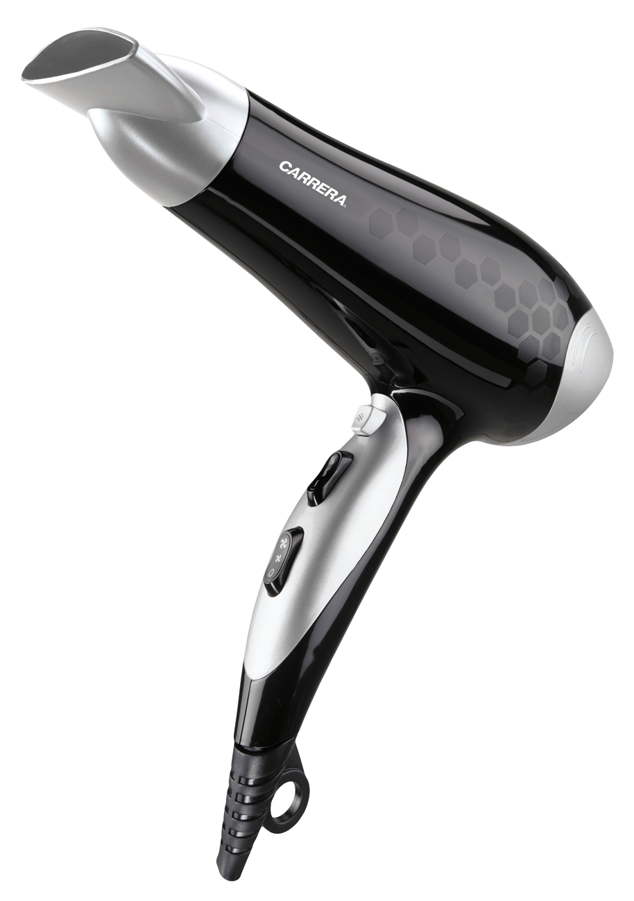 Der Carrera Red Line Haartrockner CRR ist in sportlicher Carbonoptik gefertig. Ein abnehmbares Luft-/ Haargitter gehört ebenso zur Ausstattung wie eine Stylingdüse. Reguliert wird die Leistung von 2200 Watt über einen Kippschalter für 3 Heizstufen und 2 Geschwindigkeitsstufen.