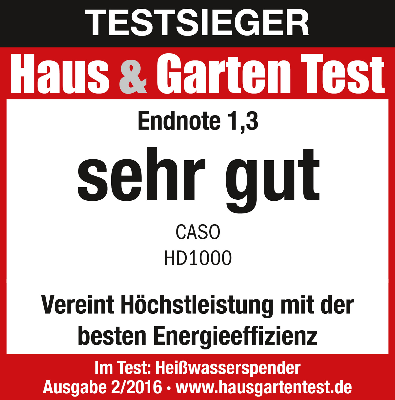 Ähnlich positiv bewerteten die Tester auch den Heißwasserspender HD 1000, der ebenfalls den Testsieg in seiner Kategorie erringen konnte. Neben der positiv bewerteten Optik und Verarbeitungsqualität, punktet der HD 1000 vor allem durch seine Technik. Nach Antippen des – laut Haus & Garten Test – perfekt reagierenden Touch-Displays vergehen lediglich fünf Sekunden bis heißes Wasser ins Gefäß der Wahl läuft. Diese extrem schnelle Aufheizzeit spart Zeit und vor allem Energie.
