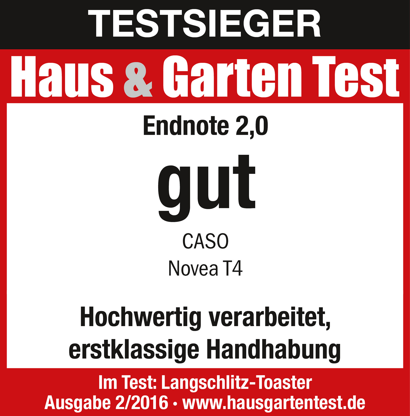 Im Bereich „Langschlitztoaster“ landete die Designmarke mit dem Produkt „T4“ aus der Novea-Designserie unangefochten auf dem ersten Platz. Neben der hochwertigen Verarbeitung und dem eleganten Design, dass den Toaster zum Hingucker in jeder Küche werden lässt, überzeugte die Tester vor allem das exzellente Bedienkonzept. Die auf der Frontseite angebrachten Bedientasten und das leuchtstarke Display sorgen für eine intuitive Bedienbarkeit.