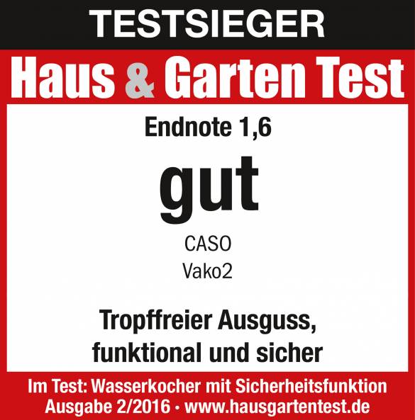 In den Bereichen Funktion und Handhabung spielt auch der dritte Testsieger, der Vako², in der Kategorie Wasserkocher mit Sicherheitssystem seine Stärken aus. Durch sie sehr gut funktionierende Vakuumisolierung schafft es der Wasserkocher, kochendes Wasser nach einer Stunde immer noch auf fast 90°C zu halten. Positiver Nebeneffekt der Isolierung sind die geringen Außentemperaturen am Gerät. Neben den drei Testsiegern wurden der Wasserkocher WK 2500 (Note 1,6), die Kaffeemaschine C4 aus der Novea-Designserie (Note 2,0) und der Eierkocher E9 (Note 2,1) jeweils mit dem Testurteil „gut“ ausgezeichnet.