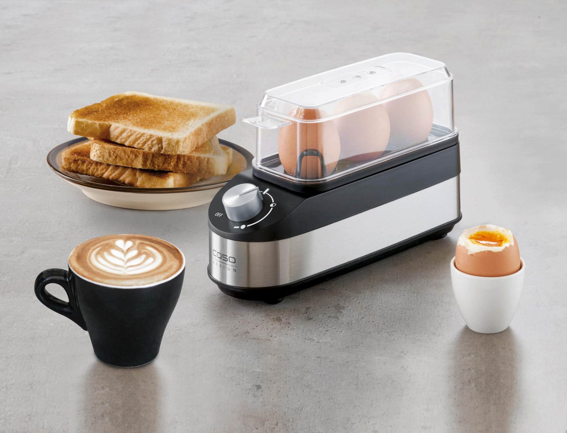 Mit dem Eierkocher E3 von Caso können ein, zwei oder drei Eier gegart werden – passend für kleine oder Single-Haushalte.