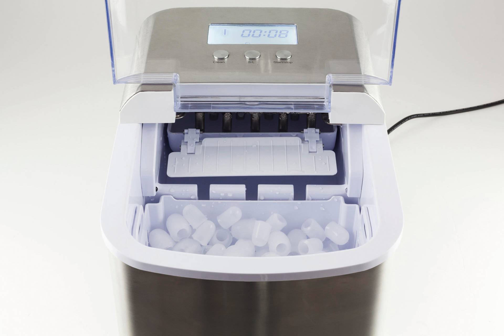 Mit der übersichtlichen Bedienung ist das Gerät mit Hilfe des LED Displays intuitiv zu bedienen. Durch den transparenten Deckel lässt sich die Eiswürfelherstellung beobachten, ohne das Gerät zu öffnen. Die fertigen Eiswürfel werden in einem herausnehmbaren Behälter gesammelt. Sobald dieser voll ist, stoppt das Gerät und auf dem Display leuchtet eine Anzeige. Mit der Reinigungsfunktion wird die Eiswürfelmaschine mit Wasser durchgespült.
