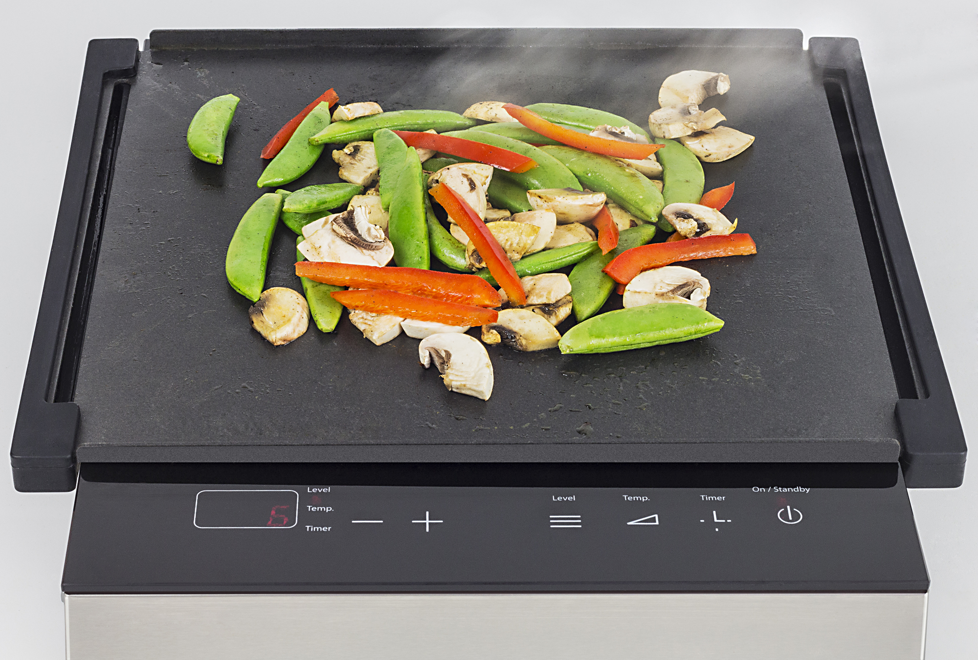 Die Teppanyaki-Grillplatte hat beim Caso Grill S-Line 2100 Tablegrill-Set eine glatte, mit kratzfester Qualitätskeramik antihaftbeschichtete Oberfläche und wird auf das Induktionsfeld aufgesetzt. Wärmeisolierte, abnehmbare Silikongriffe an der Grillplatte schützen nicht nur vor Hitze, sie nehmen auch in der eingelassen Auffangrinne überschüssiges Fett und Öl auf.