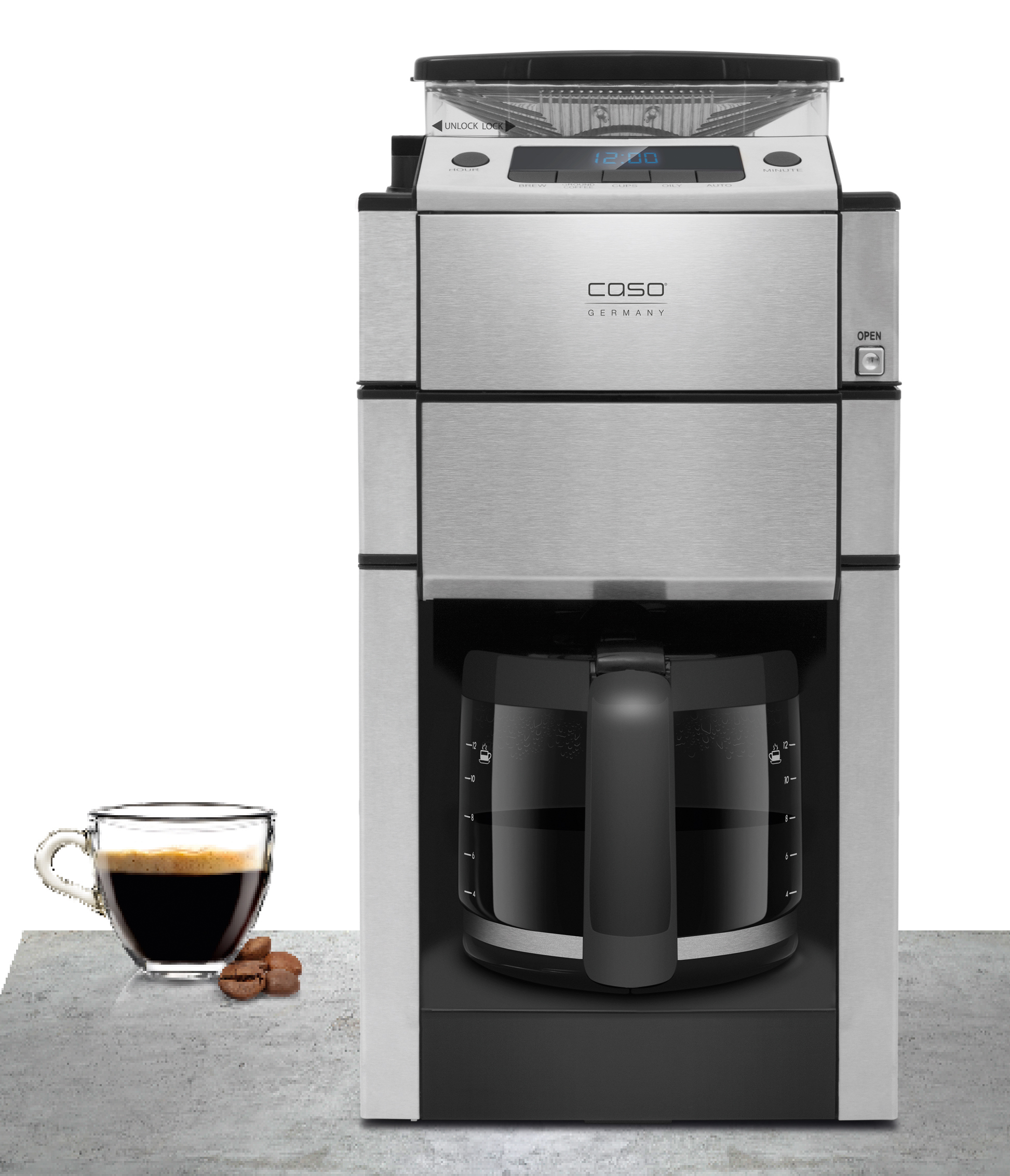 Die Caso Kaffeemaschine Coffee Duo ist mit einem konischen Kegelmahlwerk für drei Mahlgrade von fein über mittel bis grob ausgestattet. Aus dem abnehmbaren Bohnenbehälter wird der Kaffee dem Mahlwerk zugeführt und direkt vor dem Brühvorgang frisch gemahlen. Das Kaffeepulver fällt in den Gold-Ton-Filter und wird auf traditionelle Art automatisch in die Glaskaraffe gebrüht.