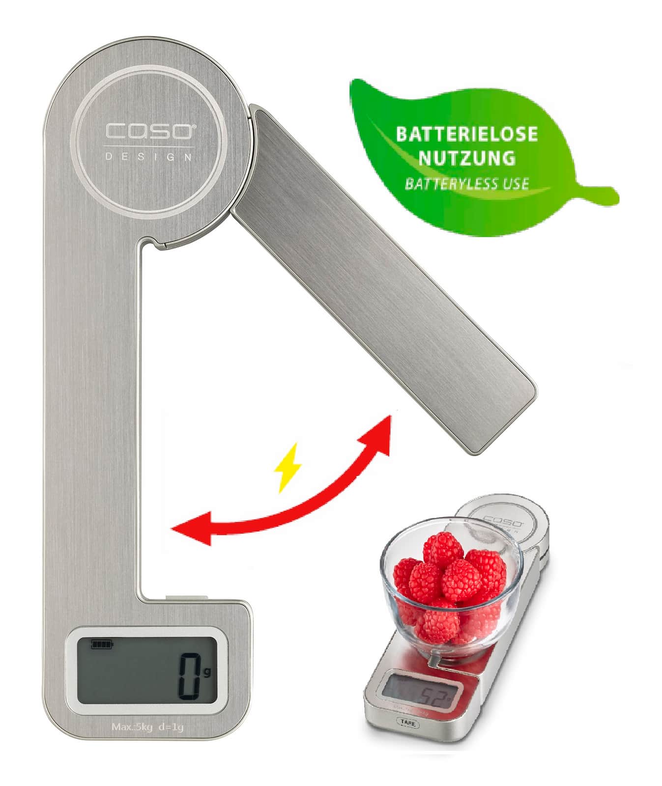 Durch Bewegen des Waagenschenkels wird für kurze Zeit Energie erzeugt und damit werden Batterien komplett überflüssig.