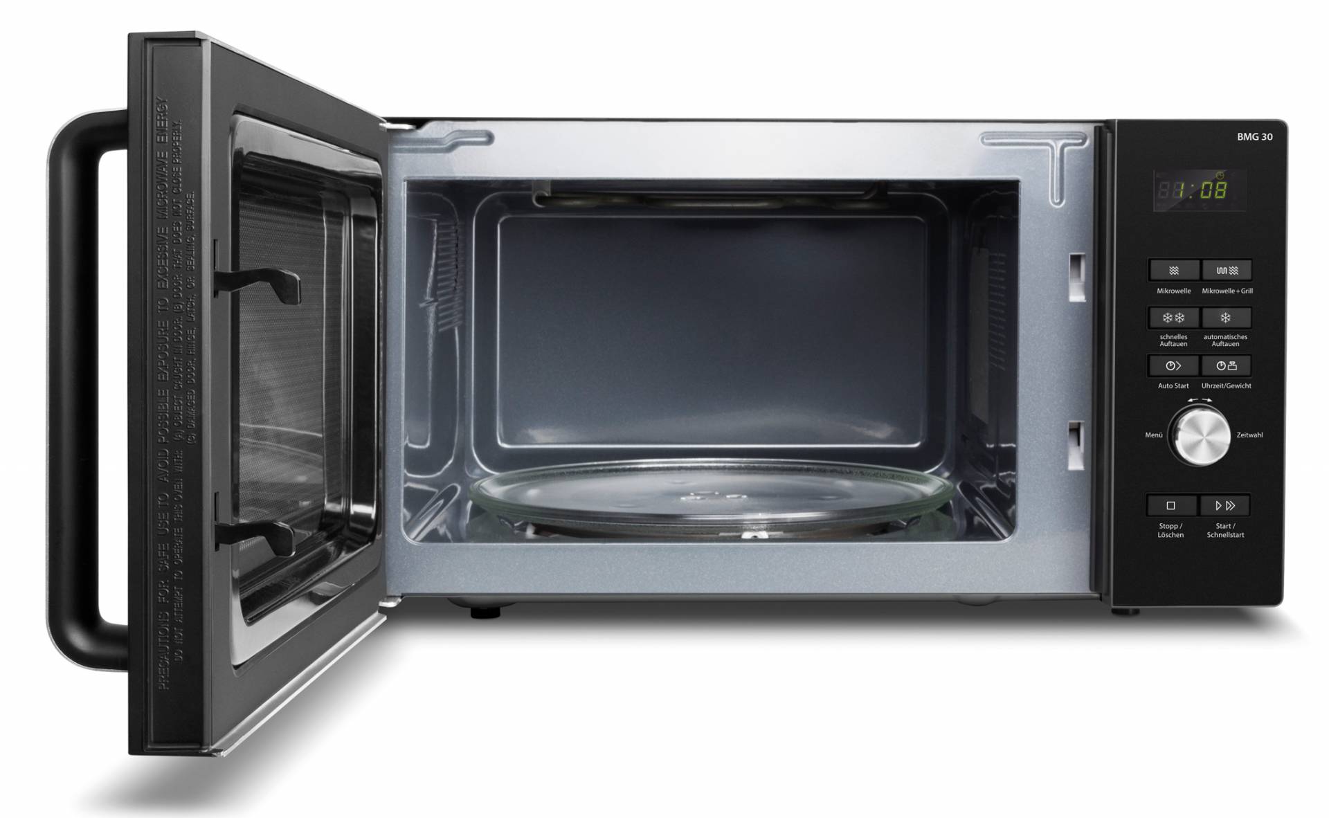 Die Mikrowelle BMG20 verfügt über eine Kapazität von 20 Liter, 800-Watt- Mikrowellenleistung, einen leistungsstarken 900-Watt-Grill und neun Automatikprogramme. Der Innenraum ist grau lackiert. Mit einer Kapazität von 25 Litern kann die Mikrowelle BMCG25 aufwarten. Sie ist ausgestattet mit einem wertigen, leicht zu reinigendem Edelstahlinnenraum, einer 900-Watt- Mikrowellenleistung, einem 1.000-Watt-Grill und neun Automatikprogrammen. Zusätzlich bietet sie eine Umluft-Funktion mit 1.950 Watt Leistung.Ein 1.100-Watt Grill, 900-Watt Mikrowellenleistung und neun Automatikprogramme überzeugen bei der Design-Mikrowelle BMG30. Ihr grau lackierter Innenraum fasst 30 Liter.