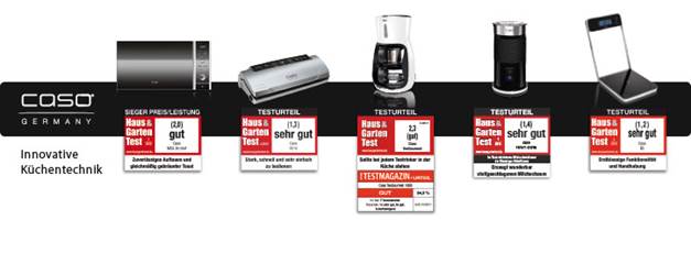 In der aktuellen Ausgabe des Magazins „Haus & Garten Test“ stellt Caso in gleich zwei Produktbereichen den jeweiligen Testsieger. Darüber hinaus konnten drei weitere Geräte in ihrer jeweiligen Produktgruppe die Tester ebenfalls überzeugen und bekommen zweimal das Testurteil „gut“ und einmal die Gesamtnote „sehr gut“.