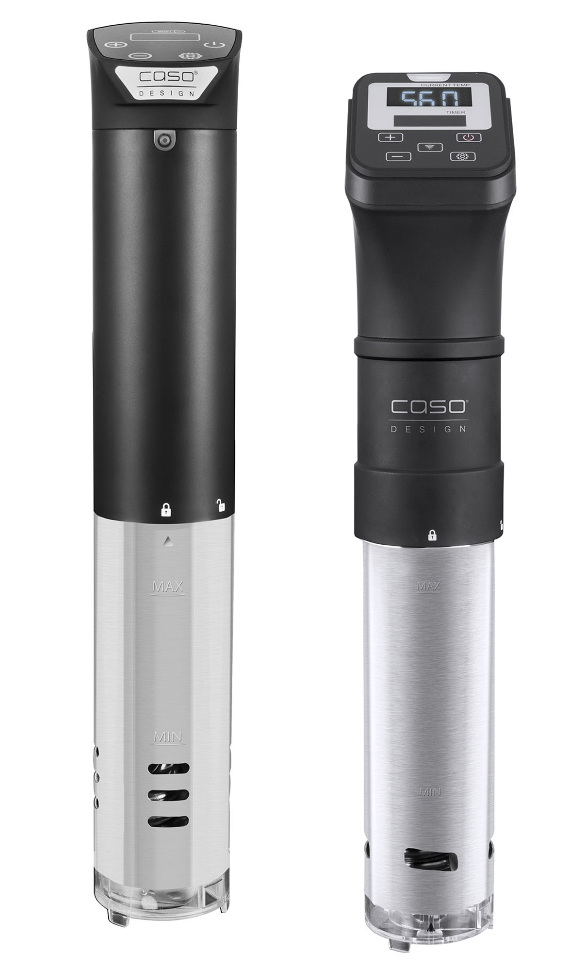 Der Caso SousVide Garer SV 1200 Smart ist auch als kleineres Gerät erhältlich. Die SousVide Garer SV 1200 Smart und SV 1200 Pro Smart unterscheiden sich in der Art der Halterung, der Form und dem Aufbau des LED-Displays. Mit der Caso Control App können die Garprozesse beider Geräte darüber von überall kontrolliert- und überwacht werden.