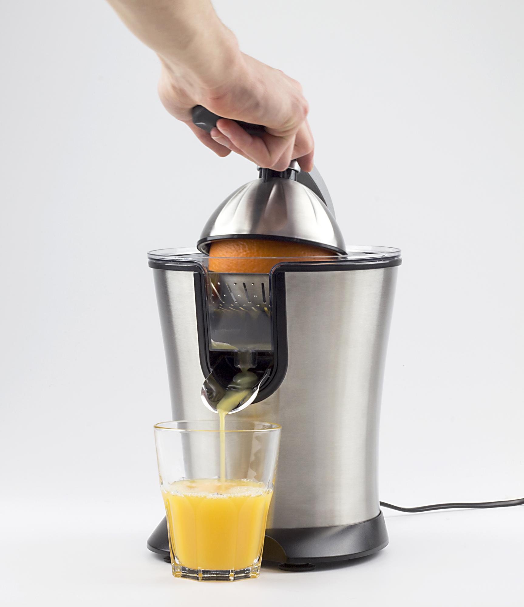 Alle Einzelteile sind entnehmbar und so leicht zu reinigen. Ein klappbarer Ausguss verhindert das Nachtropfen bei einer Unterbrechung oder bei Beendigung der Arbeit. Die Caso Zitruspresse CP 200 entsaftet als Universalgerät alle gängigen kleinen bis mittelgroßen Citrusfrüchte.