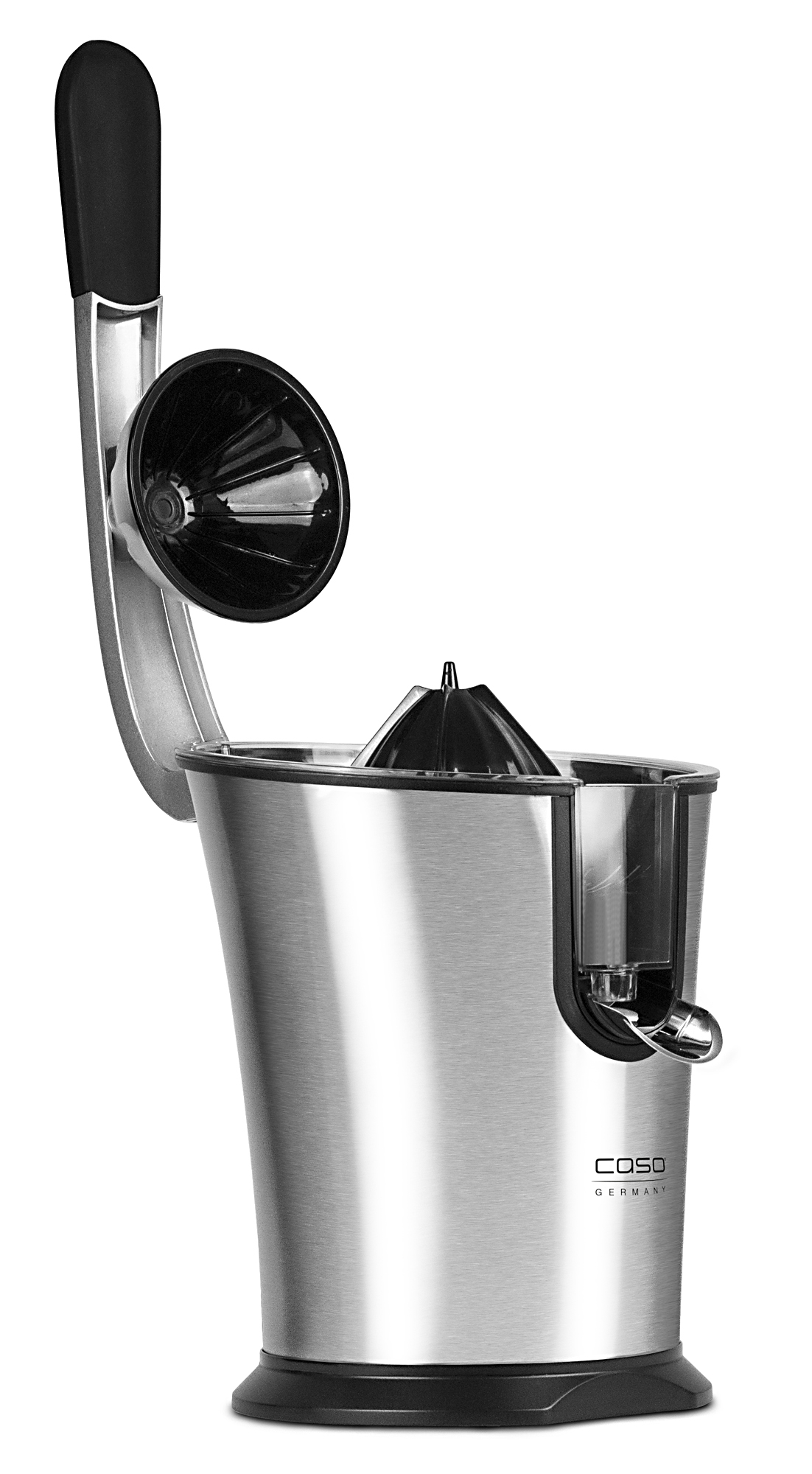 Die Caso Zitruspresse CP 300 ist aus gebürstetem Edelstahl gefertigt. Der besonders leise Motor lässt, mit einer Leistung von 160 Watt, den Universal-Presskegel in der halbierten Frucht drehen. Ohne Kraftaufwand wird das Gegenstück des Presskegels manuell mit einem Hebel mit Soft-Touch-Oberfläche auf die Frucht gedrückt. Der hochwertige Edelstahl-Siebeinsatz hält Fruchtfleisch und Kerne zurück, während der frische Saft in das bereitgestellte Gefäß läuft. Dabei sorgen Saugfüße für sicheren Stand des Gerätes. Alle Einzelteile sind entnehmbar und so leicht zu reinigen. Ein klappbarer Ausguss verhindert das Nachtropfen bei einer Unterbrechung oder bei Beendigung der Arbeit.