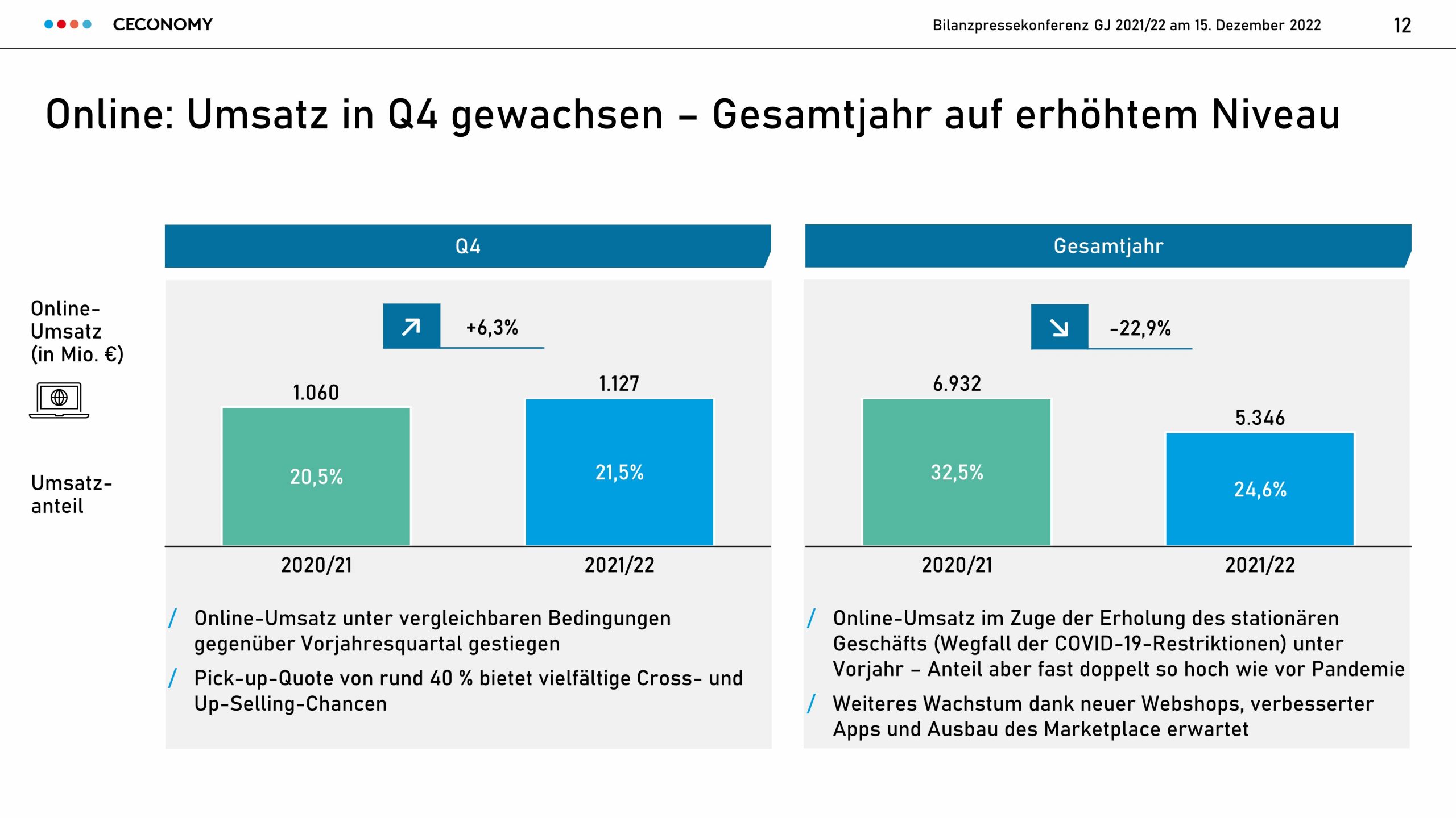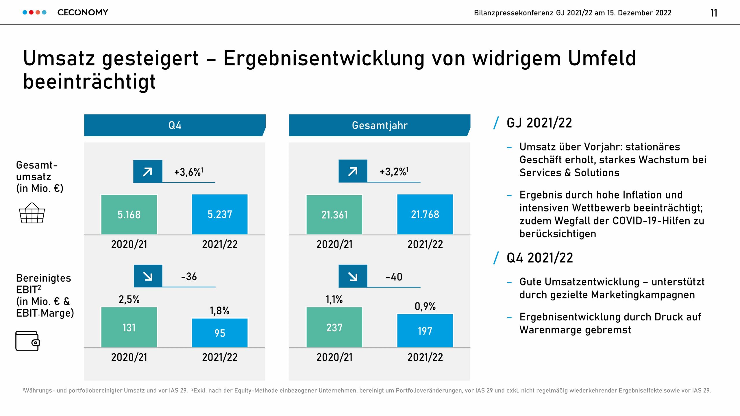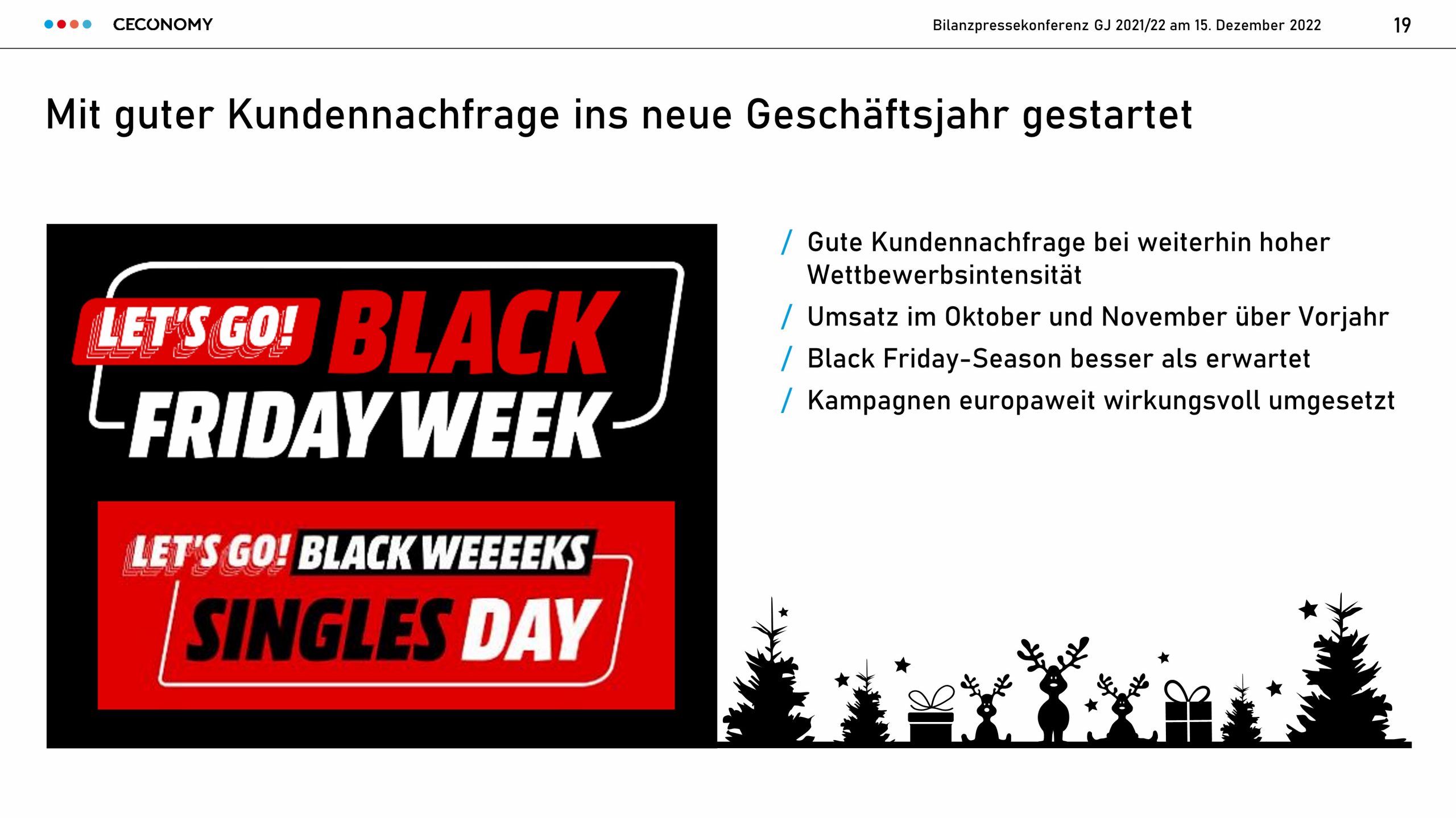 Dabei verlief der Start in das neue Geschäftsjahr 2022/23 trotz des schwierigen Umfelds recht erfreulich. Der Umsatz habe im Oktober und November das Vorjahresniveau übertroffen. Und auch das Geschäft rund um den Black Friday sei besser verlaufen als zunächst erwartet. Für das gesamte Geschäftsjahr 2022/23 geht man bei Ceconomy von einem leichten Umsatzanstieg sowie einer deutlichen Verbesserung beim bereinigten Ergebnis vor Zinsen und Steuern (Ebit) aus.