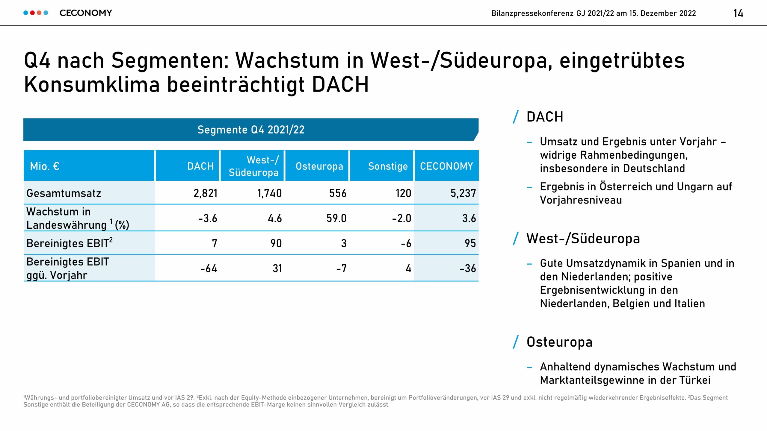 Das bereinigte operative Ergebnis betrug 197 Mio. EUR (Vj. 237 Mio. €). Das Unternehmen erzielte in allen Regionen außerhalb der DACH-Region (Deutschland, Österreich, Schweiz, Ungarn) Ergebnisverbesserungen. Im Segment DACH wurde die Ergebnisentwicklung „in einem intensiven Wettbewerbsumfeld“ durch die gestiegene Inflation gebremst. Zudem ist im Vergleich zum Vorjahr der Wegfall der Covid-19-Unterstützungsleistungen zu berücksichtigen.