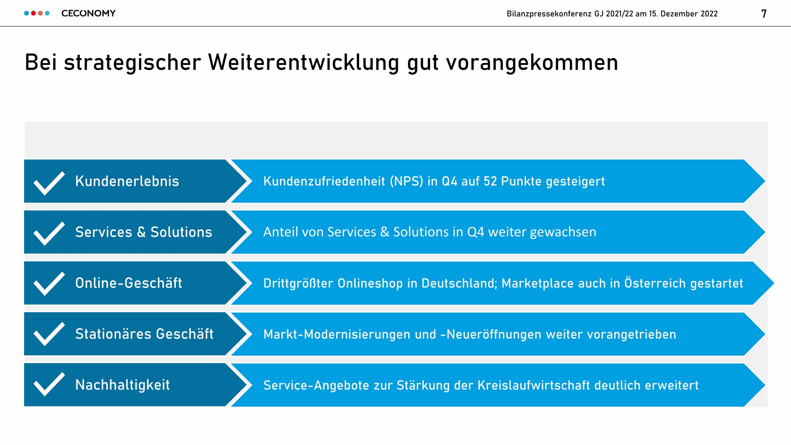 Und das sagen die Zahlen: Ceconomy hat im Geschäftsjahr 2021/22 Widerstandskraft gezeigt und den oberen Bereich ihrer im Juli aktualisierten Prognose erreicht. Trotz verschärfter wirtschaftlicher Rahmenbedingungen steigerte das Unternehmen den Umsatz um 3,2% auf 21,8 Mrd. Euro (Vorjahr: 21,4 Mrd. €). Zu diesem Wachstum haben die deutliche Erholung des stationären Geschäfts und die dynamische Entwicklung im Bereich Services & Solutions beigetragen.