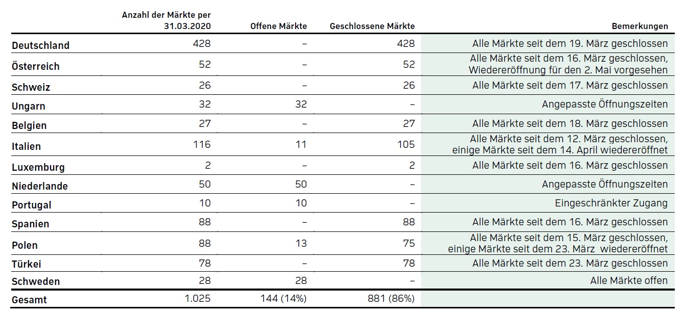 Dabei gab es Gründe genug, um sich in der Öffentlichkeit bemerkbar zu machen: Bis auf ganz wenige Ausnahmen (u.a. Niederlande, Schweden, Ungarn) waren die Märkte beider Marken vom „Lock-down“ des Handels betroffen. Alle 428 deutschen Märkte waren seit dem 19. März geschlossen. Europaweit waren Dienstagmorgen 881 von 1.025 Märkten dicht. Ein Desaster, durch das die hausgemachten Probleme noch offener zutage treten.