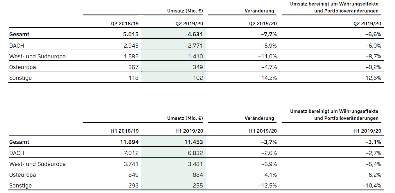 - Der Umsatz ging währungs- und portfoliobereinigt um –6,6% zurück; der berichtete Umsatz sank um –7,7% auf 4.631 Mio. Euro; der Rückgang ist ausschließlich auf Store-Schließungen im Zusammenhang mit Covid-19 zurückzuführen; in den Monaten Januar und Februar stieg der Umsatz währungs- und portfoliobereinigt um +3,7%.