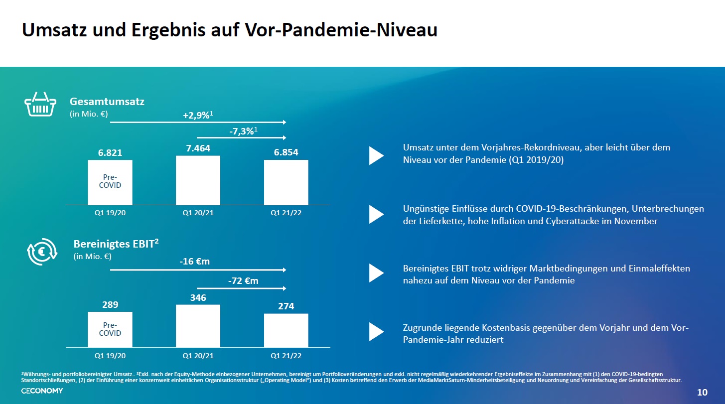 Eine bessere Einordnung der jüngsten Ceconomy-Ergebnisse bietet der Vergleich mit den Kennzahlen des ersten Quartals 2019/20. Gegenüber diesem Zeitraum, der von einem stabilen konjunkturellen Umfeld vor Beginn der Pandemie gekennzeichnet war, ist der aktuelle Quartalsumsatz währungs- und portfoliobereinigt um 2,9% höher ausgefallen (Q1 2019/20: 6,8 Mrd. €). Beim operativen Ergebnis hatte Ceconomy damals 289 Mio. EUR erreicht.
