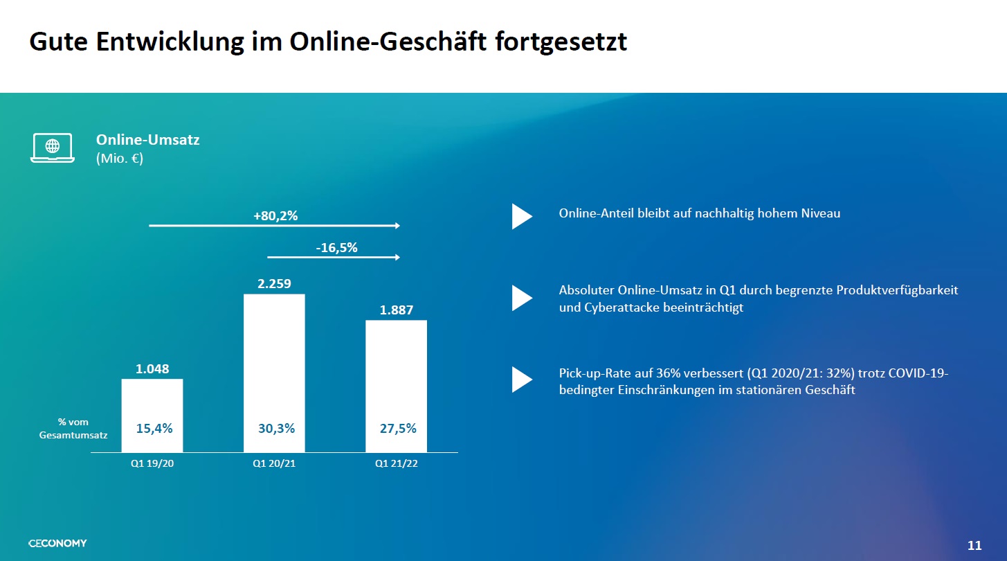 Die Omnichannel-Strategie des Unternehmens hat im 1. Quartal „wesentlich zu einem soliden Geschäftsverlauf“ beigetragen. Die Entwicklung im Online-Geschäft habe sich im Berichtszeitraum mit einem Umsatz von knapp 1,9 Mrd. EUR (Q1 2020/21: 2,3 Mrd. EUR) „weiter verfestigt“. Der Anteil am Gesamtumsatz lag bei 27,5% und damit deutlich höher als noch im 4. Quartal des Vorjahres (20,5%). Im Vergleich zum 1. Quartal des Geschäftsjahres 2019/20 ist der Online-Umsatz gar um gut 80% gewachsen.