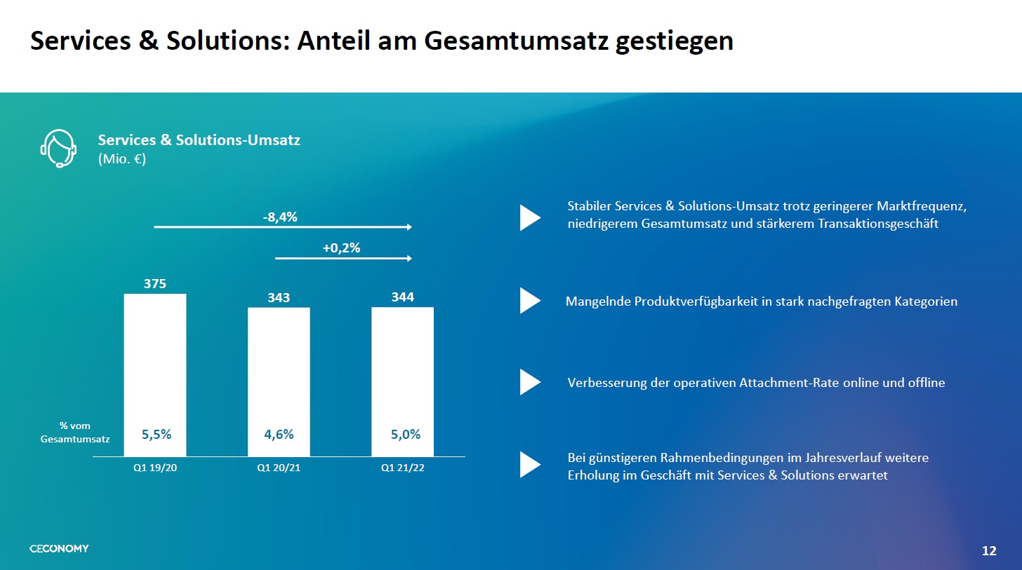 Im strategisch wichtigen Geschäft mit Services & Solutions hat Ceconomy im 1. Quartal Stabilität bewiesen. Der Umsatz erreichte 344 Mio. EUR und damit in etwa die Höhe des Vorjahreszeitraums (343 Mio. EUR). Der Anteil von Services & Solutions am Gesamtumsatz ist damit von 4,6% auf 5,0% gestiegen. Dazu haben vor